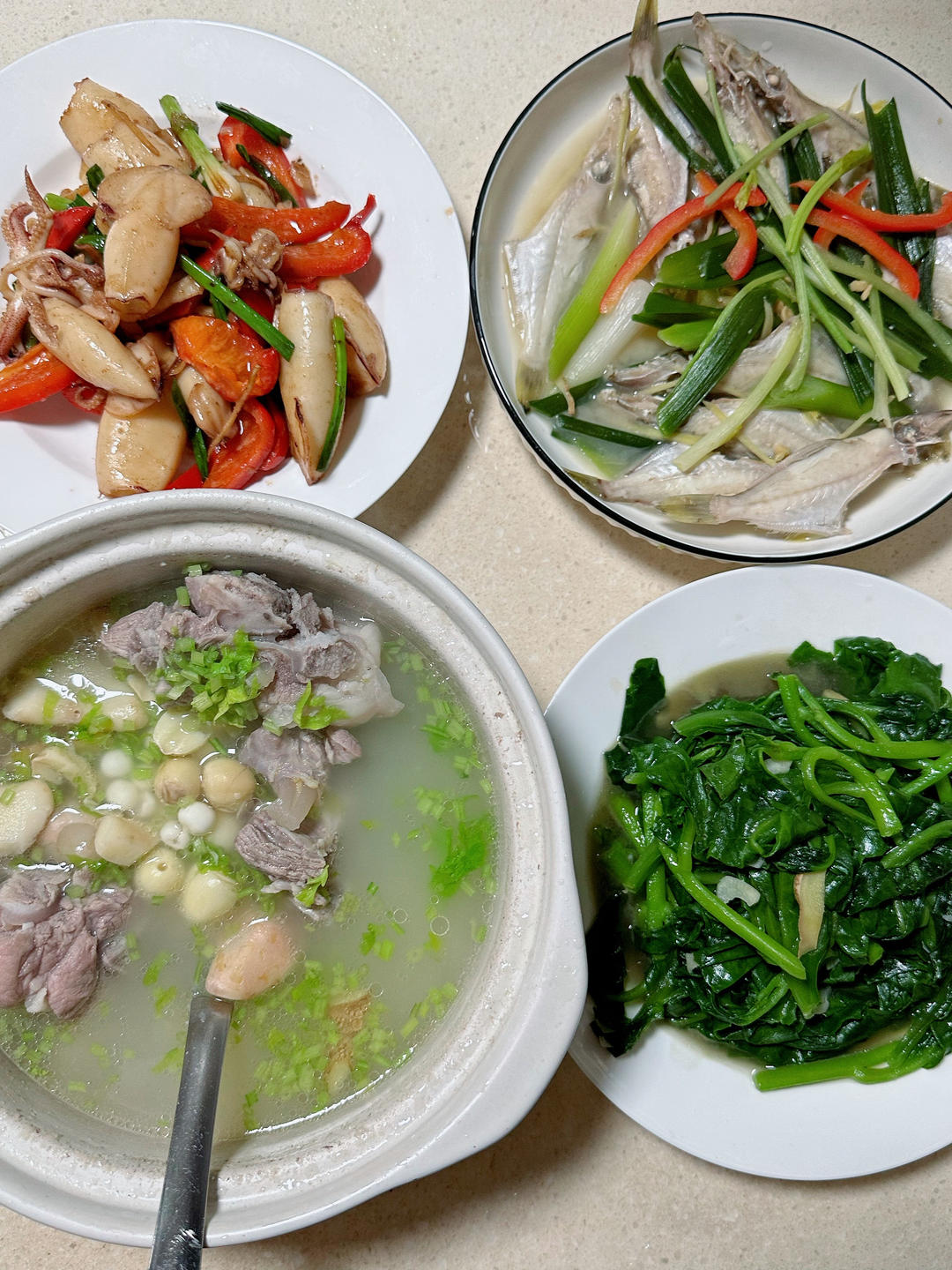 菱角芡实莲子猪大腿骨汤,迪仔鱼,鱿鱼,木耳菜。
