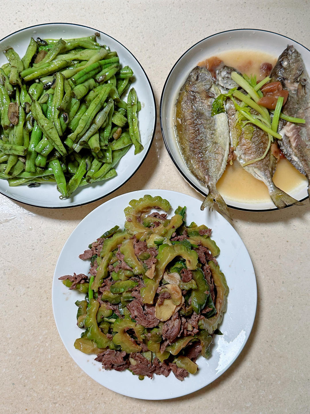 马头鱼,老鸭苦瓜黑木耳煲,龙牙白。