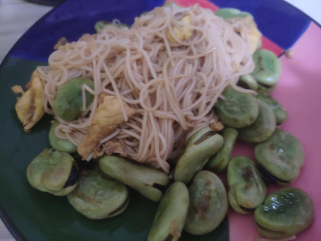 昨天剩的蚕豆又炒了冰箱里最后一个鸡蛋,拌了一点面条。