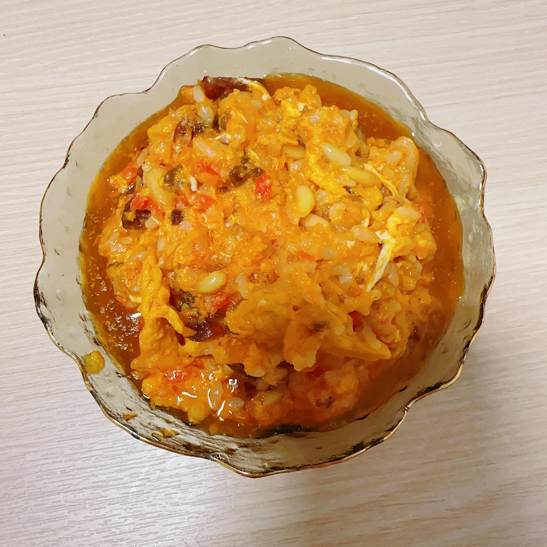 番茄➕蕃茄酱➕鸡蛋➕豆芽➕鸭肝肠➕虾皮➕松子➕米饭,多放油炒出汁,加...