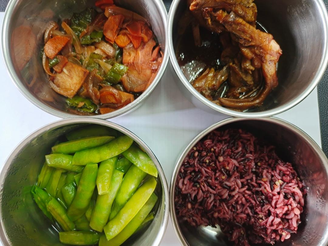 洋葱炒午餐肉,五香鸭爪,盐水豌豆荚,杂粮饭。