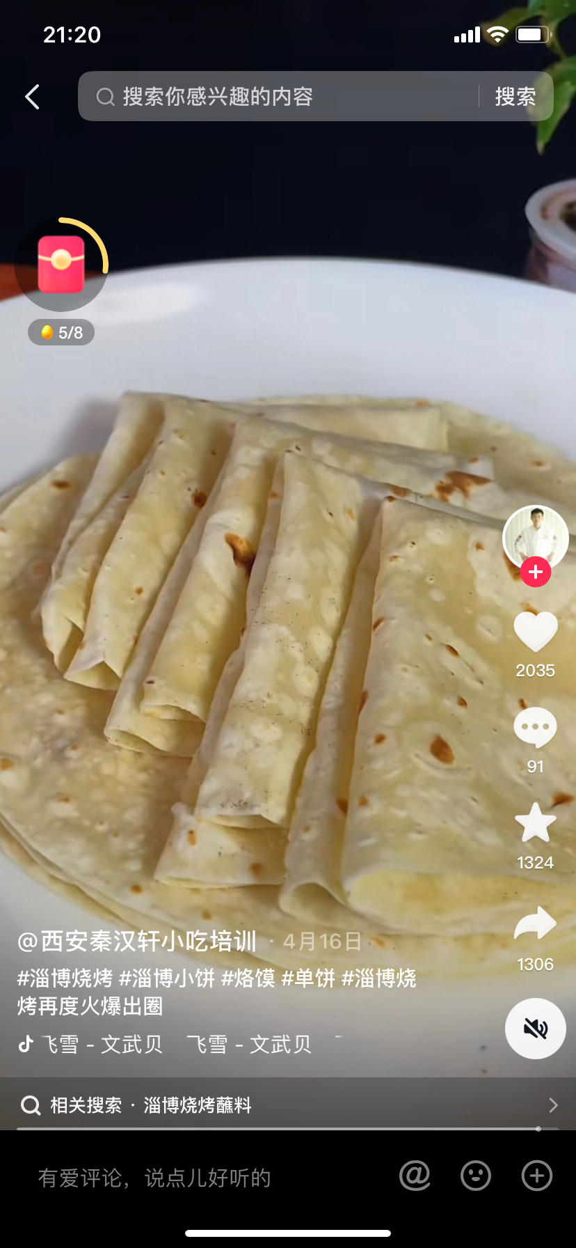 淄博小饼:300克面粉➕180克60°C水,醒面15分钟,30克一份,中小火无油烙。