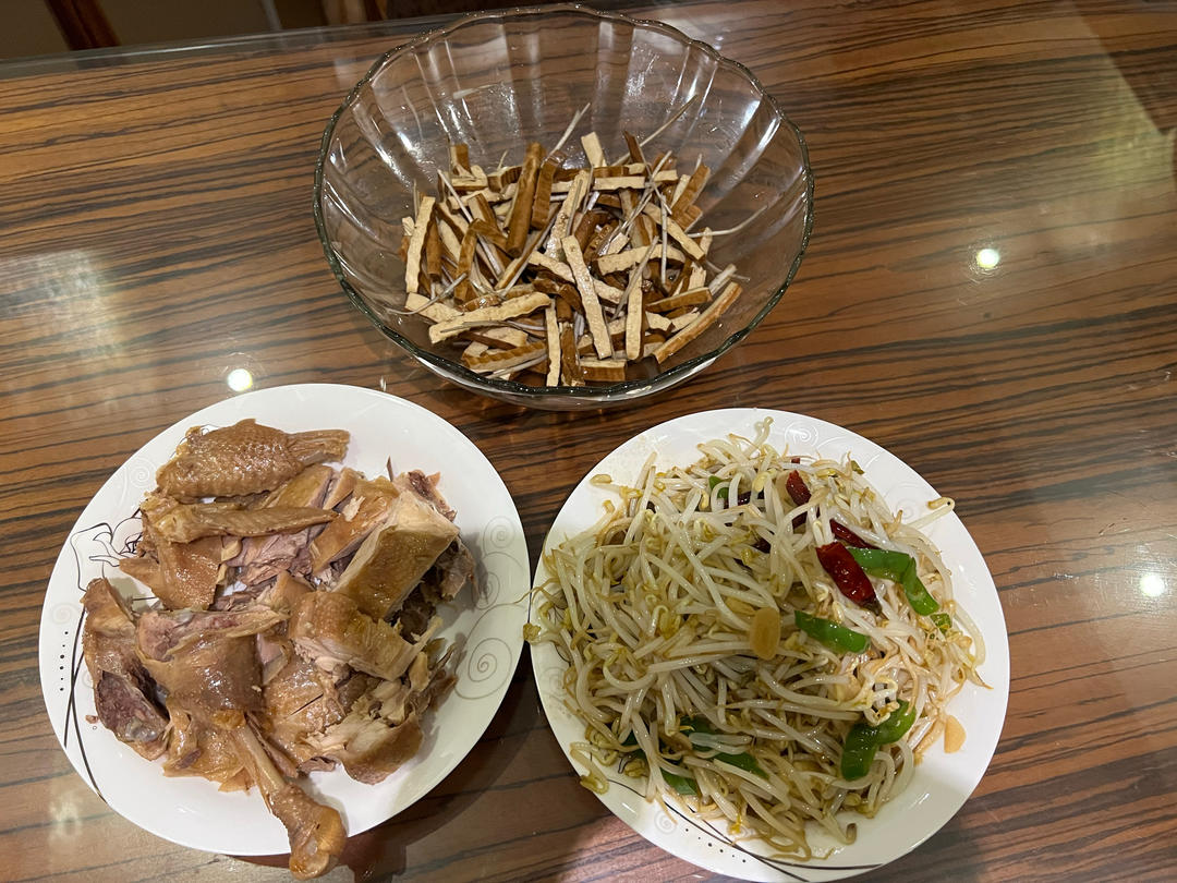 辣炒豆芽,凉拌豆干,烧鸡 。老公想吃烧鸡,有啥好吃的呢😂我不喜欢吃烧鸡