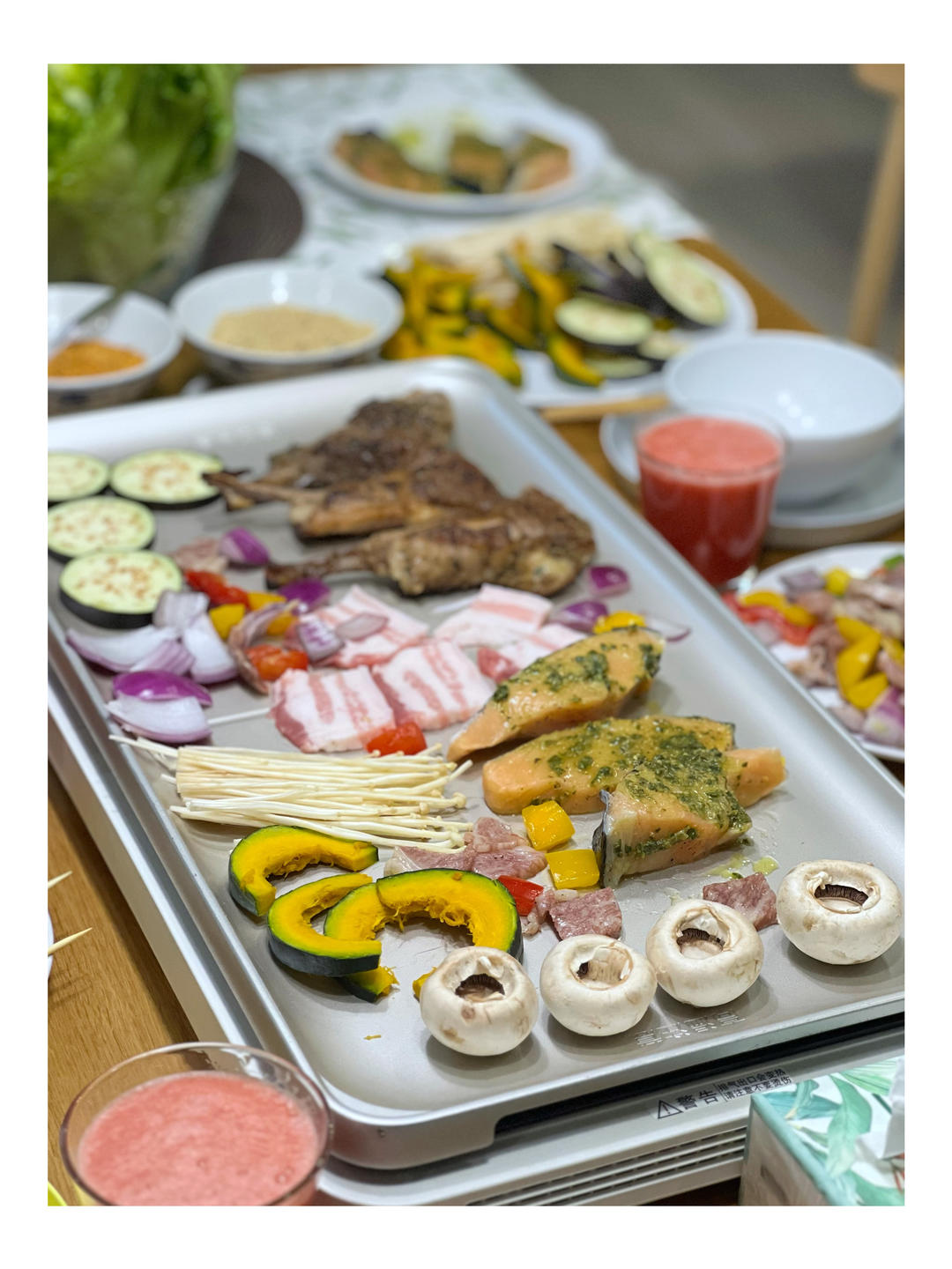 “五一 ”家庭铁板烧开烤啦~~~法式小羊排、雪花和牛、青酱三文鱼、五花肉、彩椒安格斯牛肉和鸡...