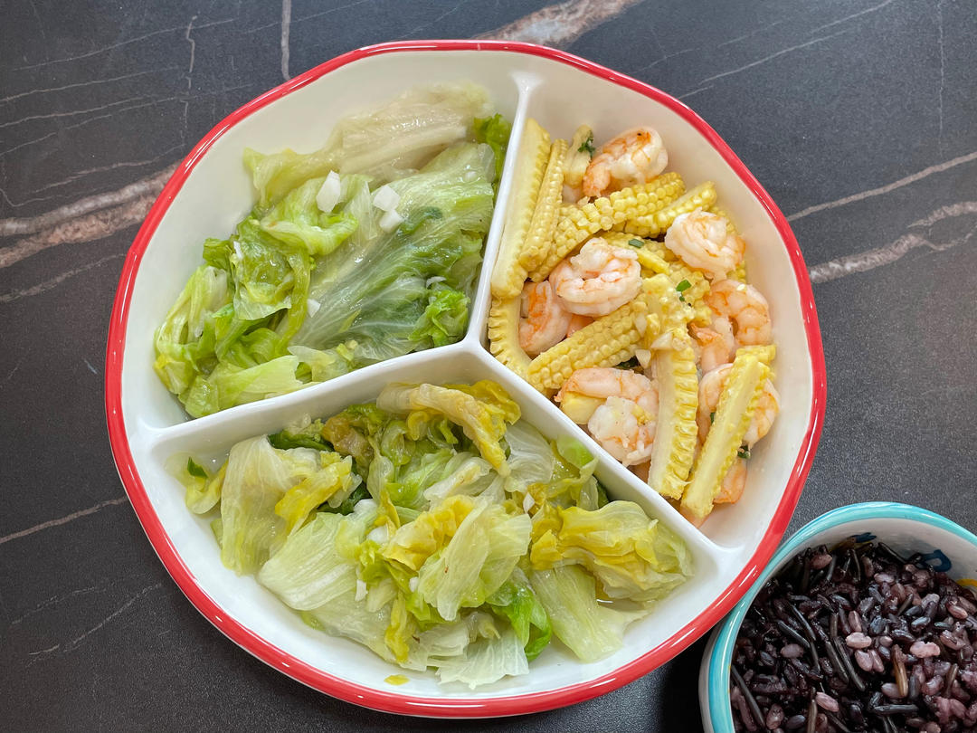 玉米笋炒虾仁+蒜蓉生菜+黑米饭