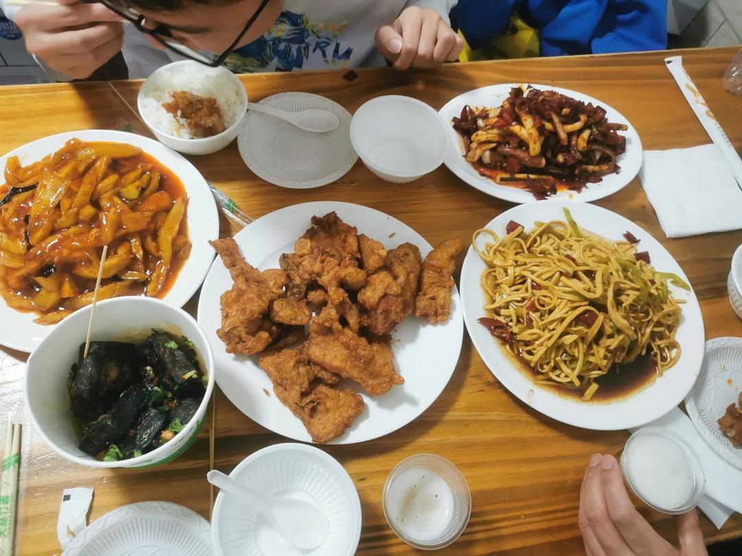 青岛台东恣儿街美食~黑色经典臭豆腐、鸭板肠、巧金陵粑粑糕(糯米蛋糕)、福来顺的炒菜!
