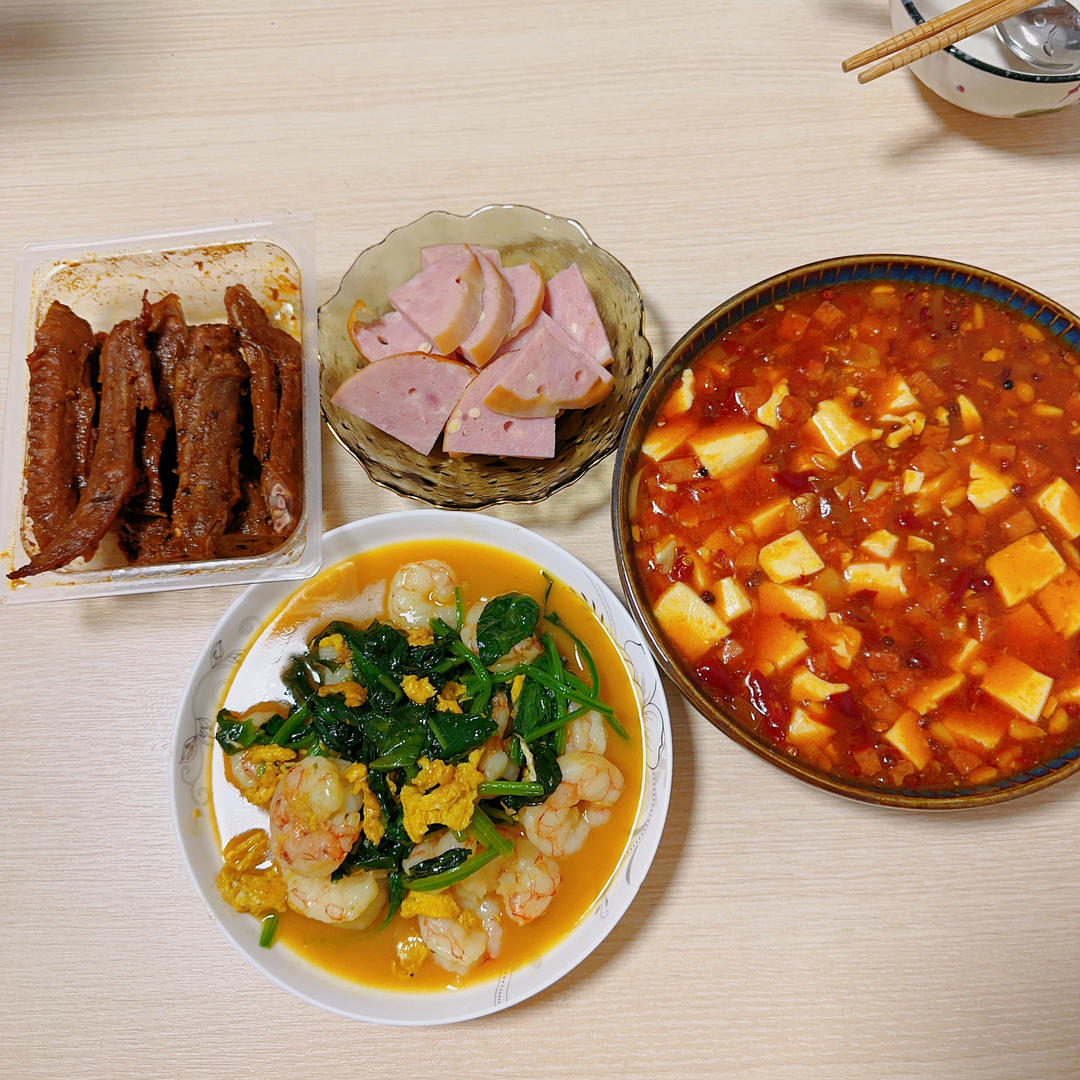 今日份的营养 ➡️ 菠菜虾仁鸡蛋➕麻婆豆腐➕肉肚➕鸭脖/鸭翅