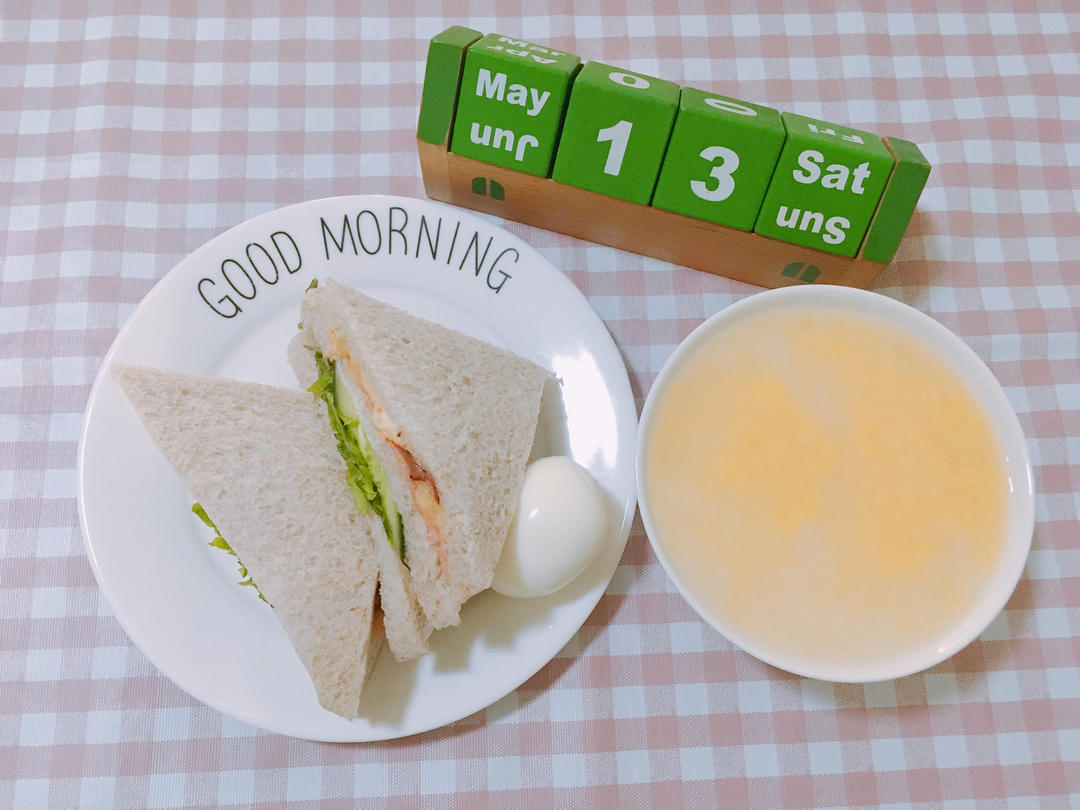 G6S2.W13Day6.牛肉火腿蔬菜三明治🥪加煮蛋🥚配玉米🌽糁粥