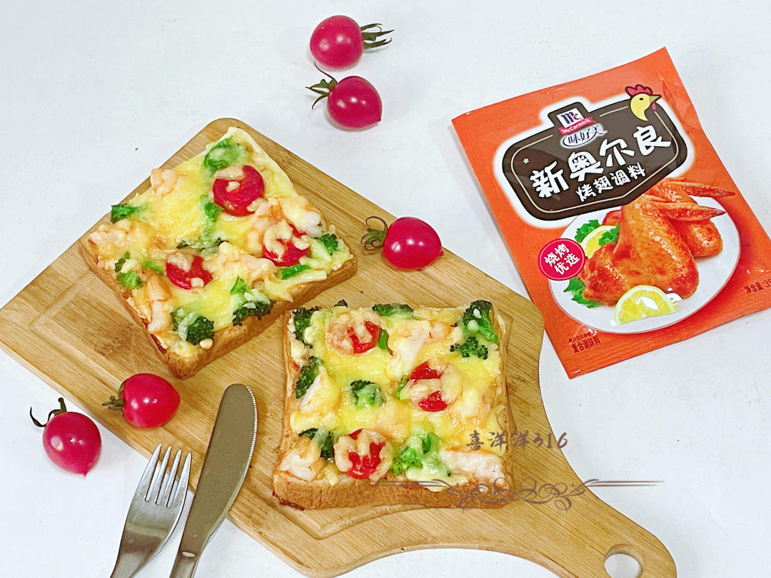 虾吐司披萨,使用味好美新奥尔良烤翅调料腌制虾,味道真的不一般,太好吃了。