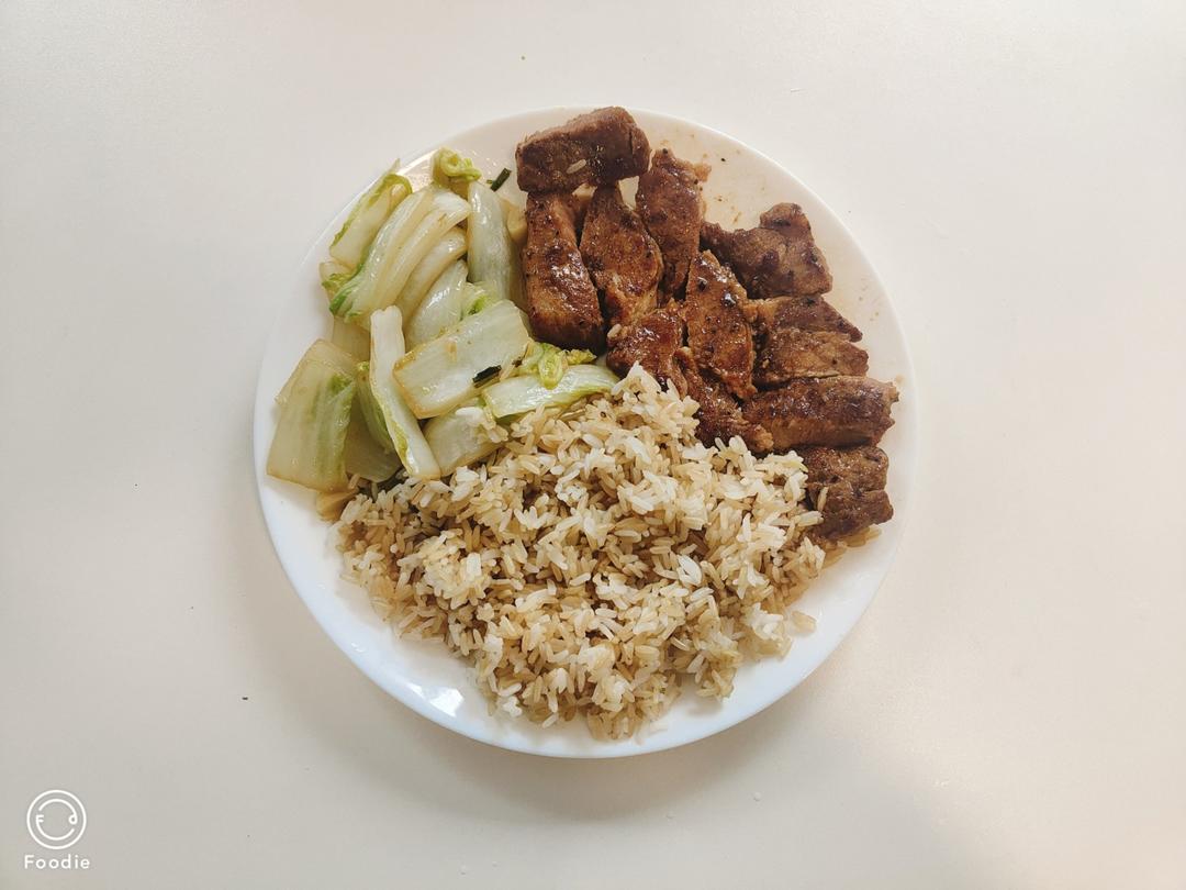 清炒娃娃菜配猪排,猪排煎太快了,没熟透,放微波炉加热了一下,下次小火慢煎