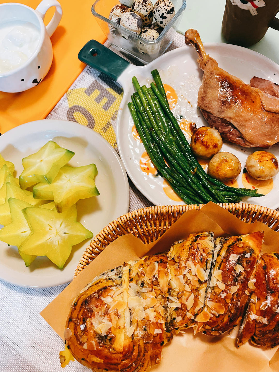丰盛🦆油封鸭腿芦笋煎蘑菇,果仁黑芝麻软欧,鹌鹑蛋,杨桃
