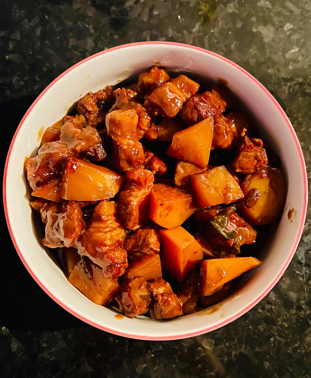 换个光线好的地方再咔嚓一张,来非洲快4年了,估计这是第二次红烧猪肉,这里的猪肉真的不那么...