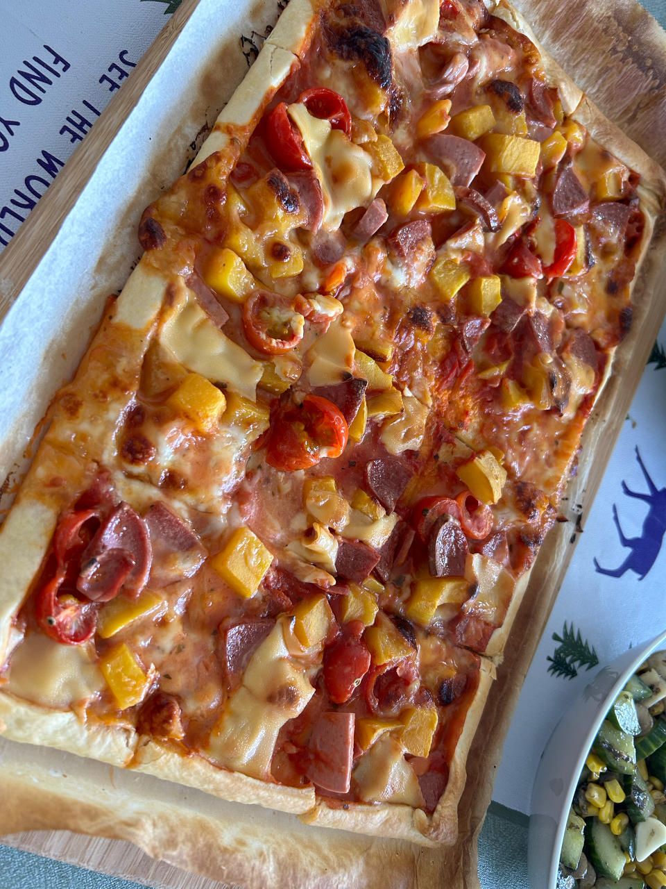 水果田园披萨:芒果,圣女果,火腿肠,水芝士和切达芝士
