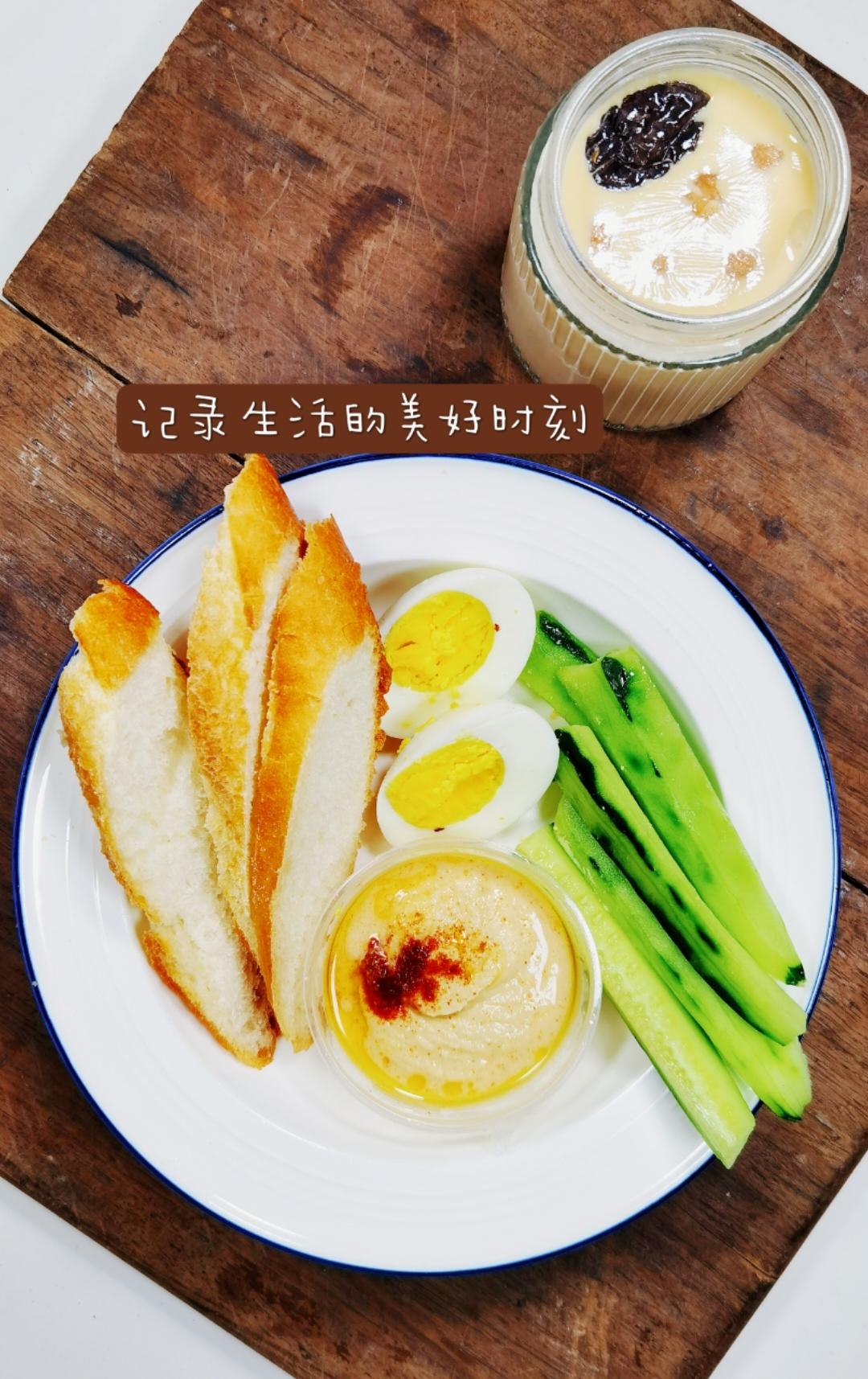 ②法棍、水煮蛋、青瓜、鹰嘴豆泥