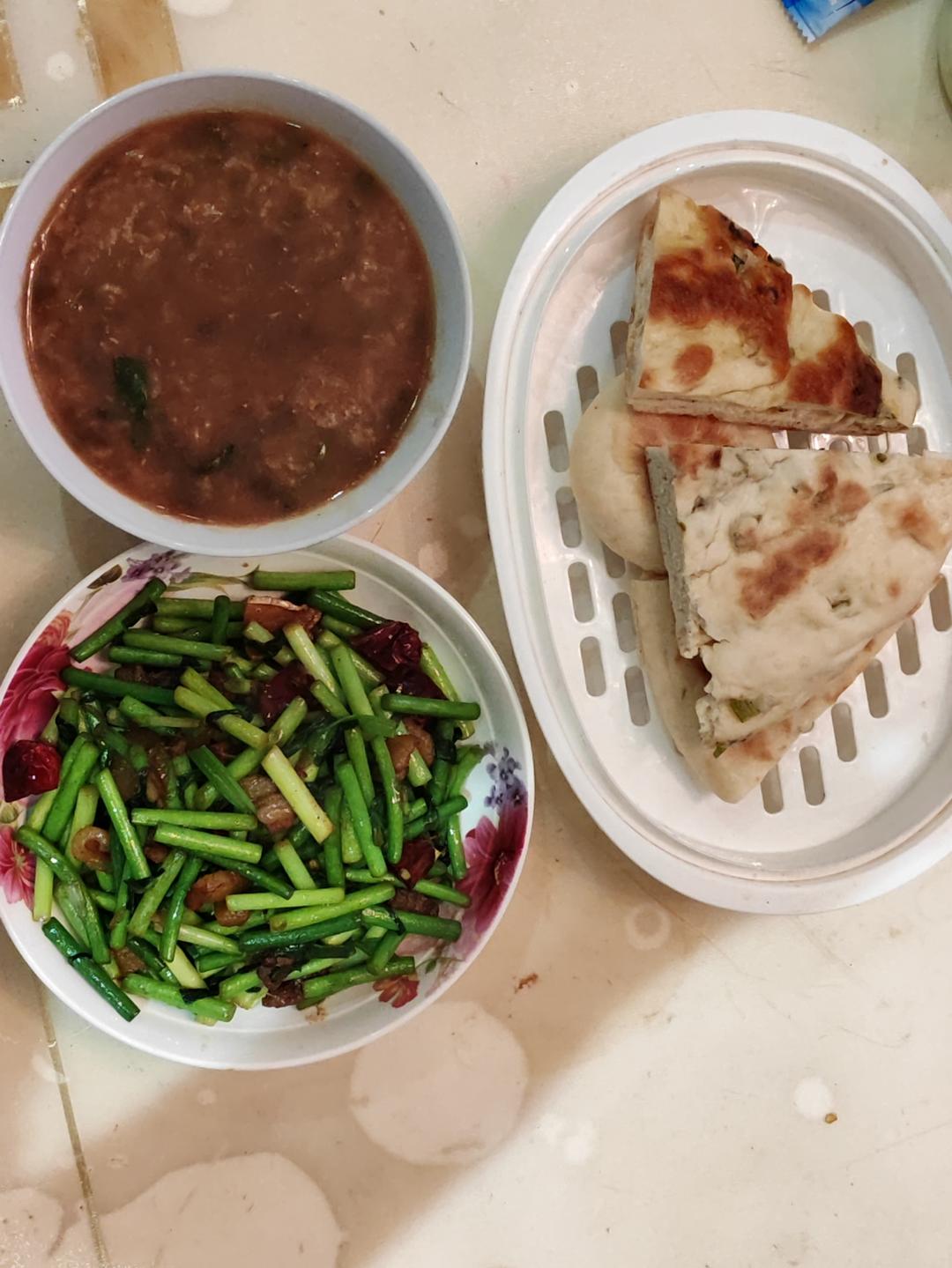 #绿豆稀饭配蒜苔炒肉#