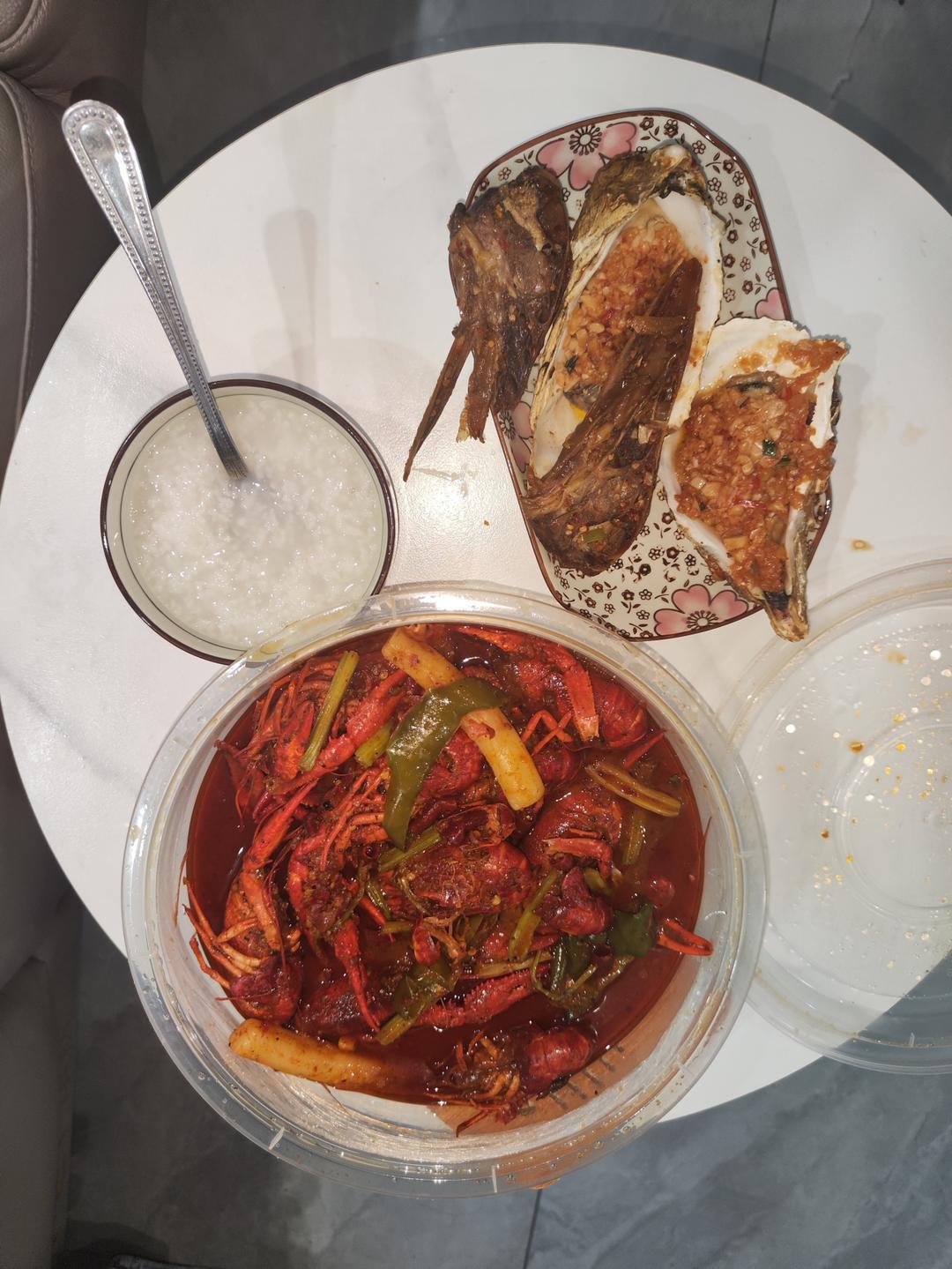老妹和阿姨的投喂。。。小龙虾和蒜蓉生蚝和粥太搭啦!!!