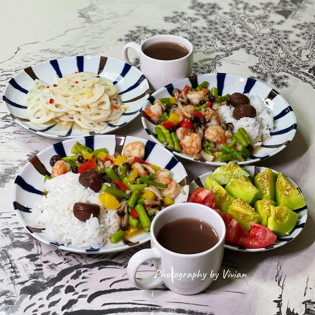 午晚餐|蟹味菇芦笋黑虎虾仁浇头+炝拌新花藕+甘栗仁米饭+粉番茄绿宝香瓜+乌梅三豆饮~🌷