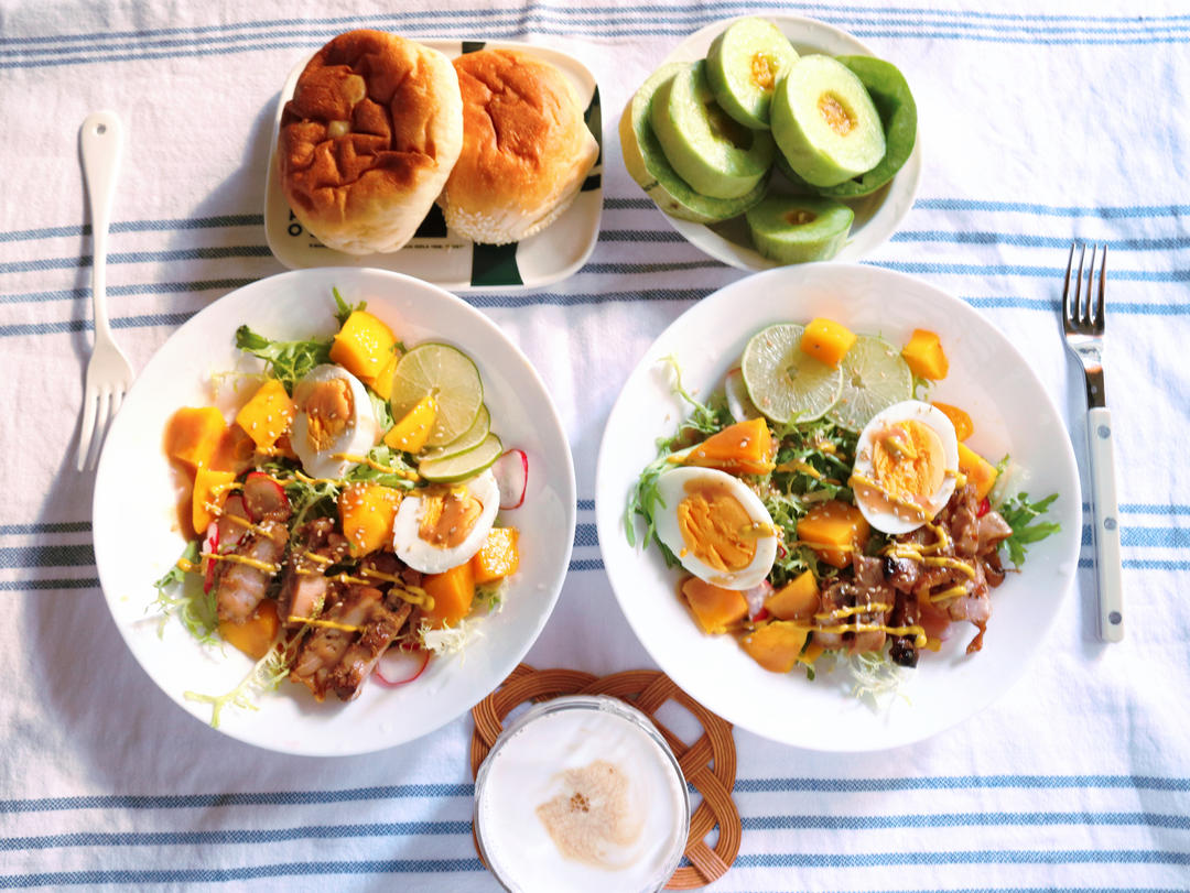 eat a rainbow 吃出一道彩虹,是日早餐:生菜鸡蛋煎鸡腿樱桃萝卜芒果沙拉 / 奶黄包 / 蜜瓜 / 厚椰乳拿铁...