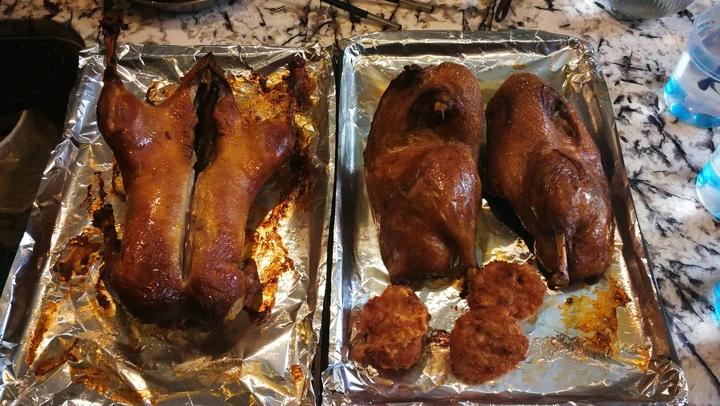 这是我首次烤鸭,左边整只的是买的袋装烤鸭半成品烤制,右边切开的是按楼主方法烤制(但卤制过程是改用成品五香卤料包)。烤鸭非...