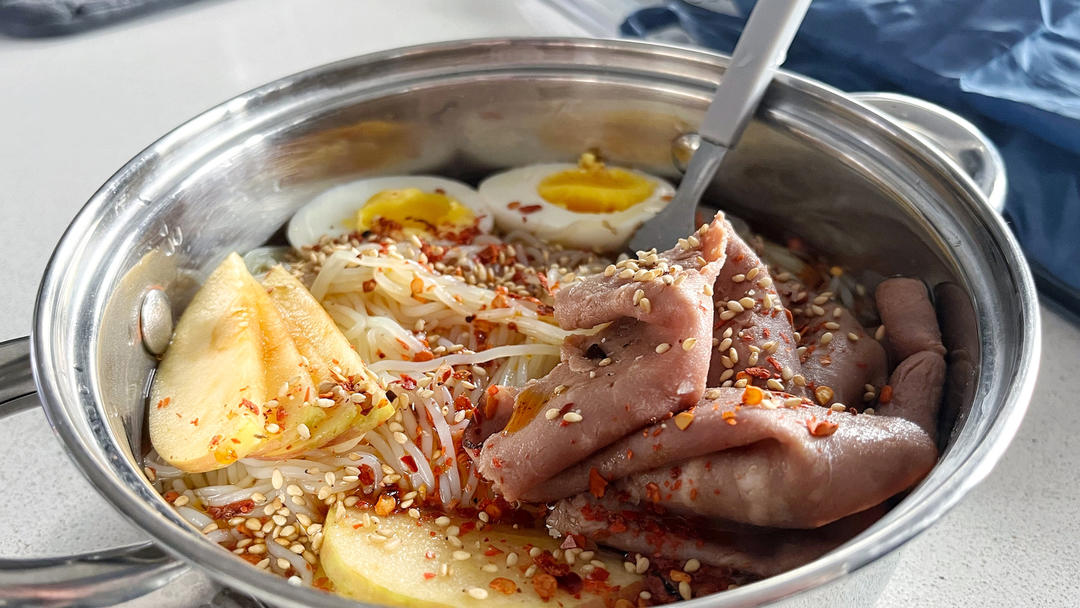 上周在亚米买卫生巾和防晒霜凑单买了袋冷面,今天吃一吃,不过家里没有泡菜没有黄瓜没有梨,甚至没有筷子😂😂上次去超市特意买了...
