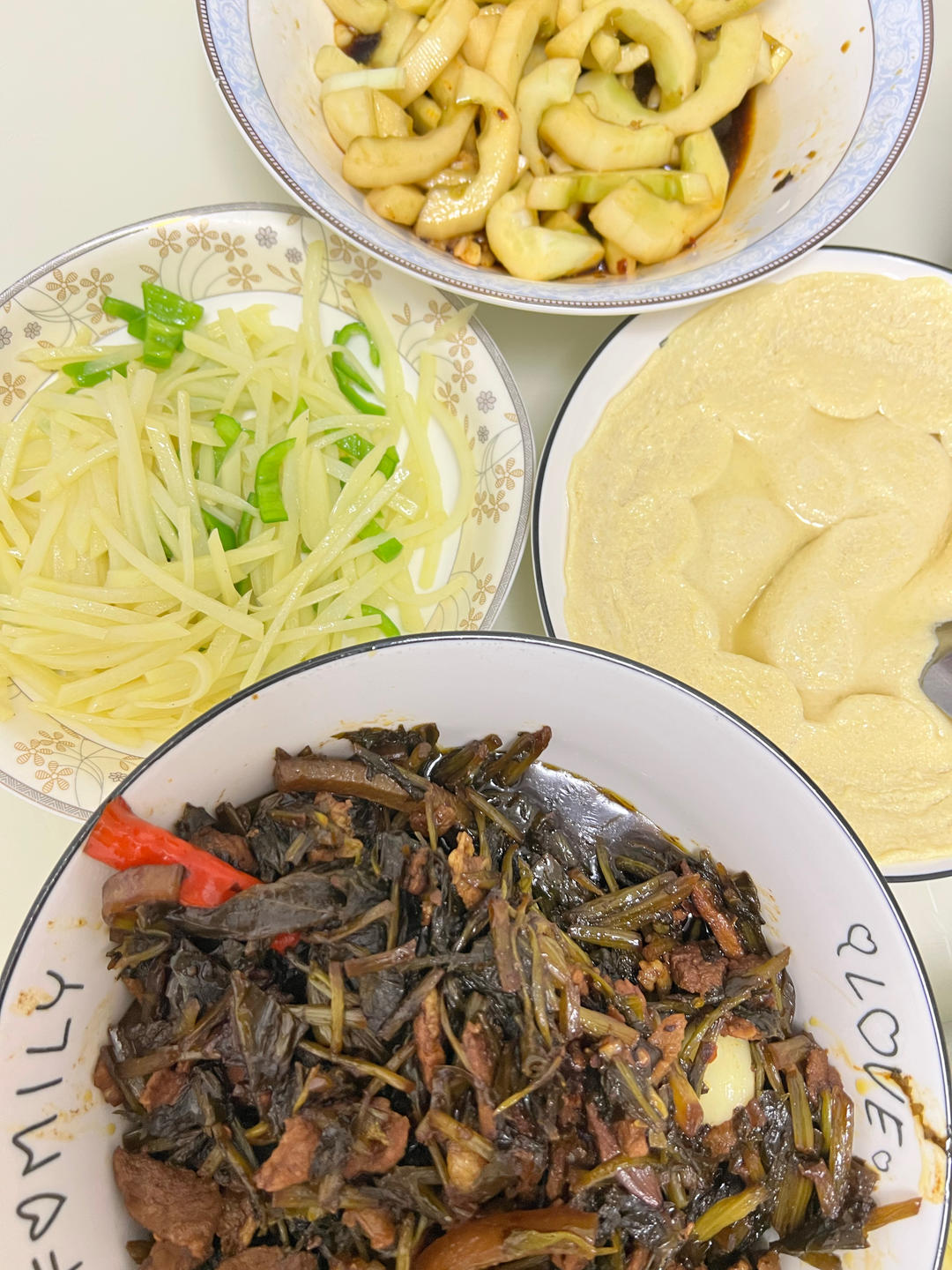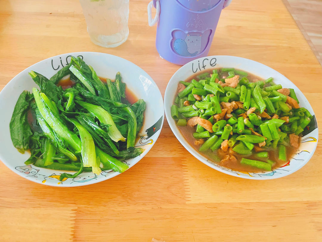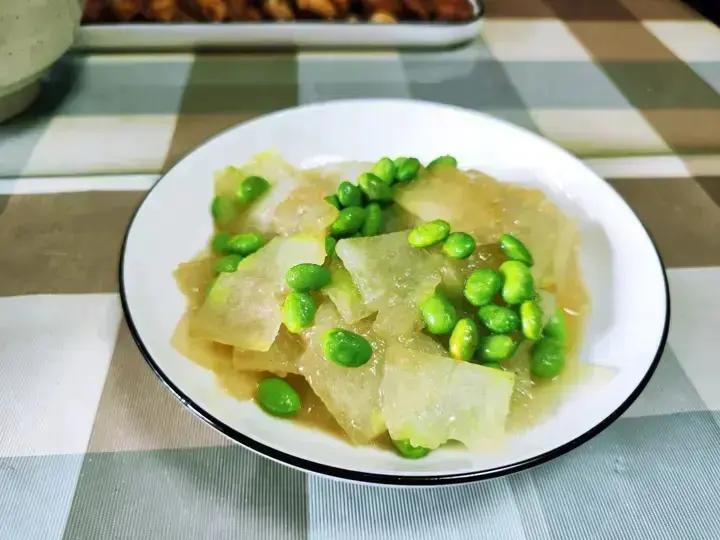 冬瓜炒毛豆、红烧带鱼、育青鸡、煲芡实薏米排骨汤、绿豆汤、甜瓜😁