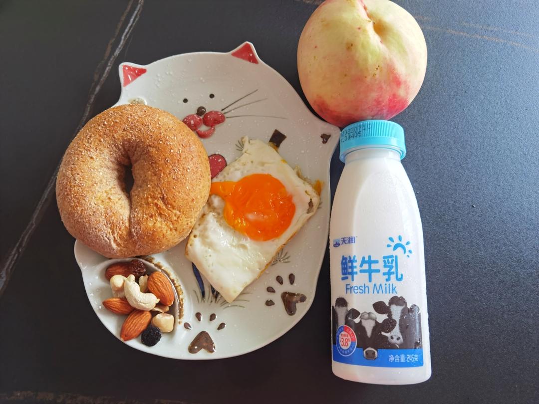 又是吃减脂餐的一天🤣今日早餐:全麦贝果+煎蛋+牛奶+桃子🍑+坚果