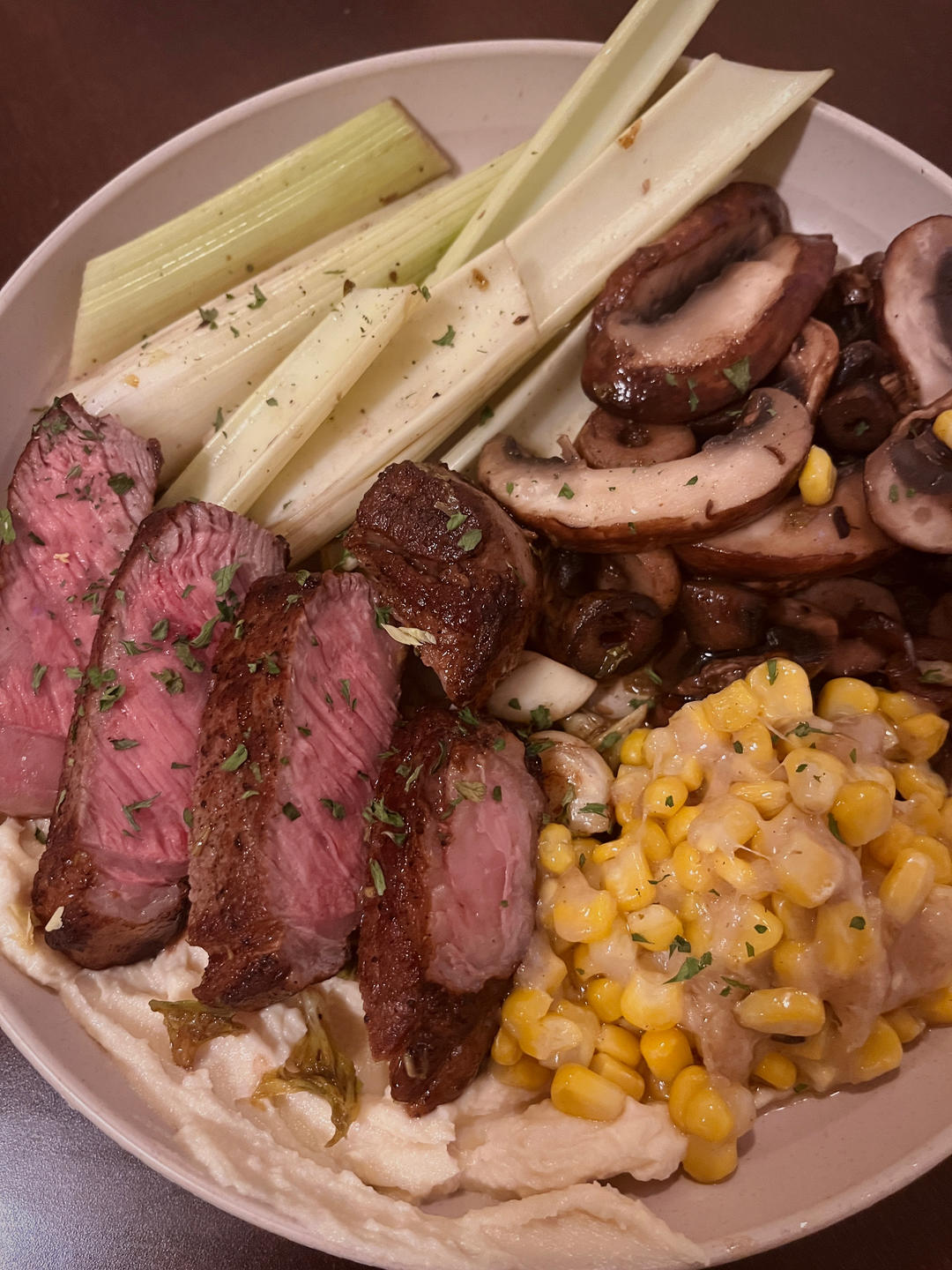 牛排佐鹰嘴豆泥配芹菜蘑菇芝士黄油玉米