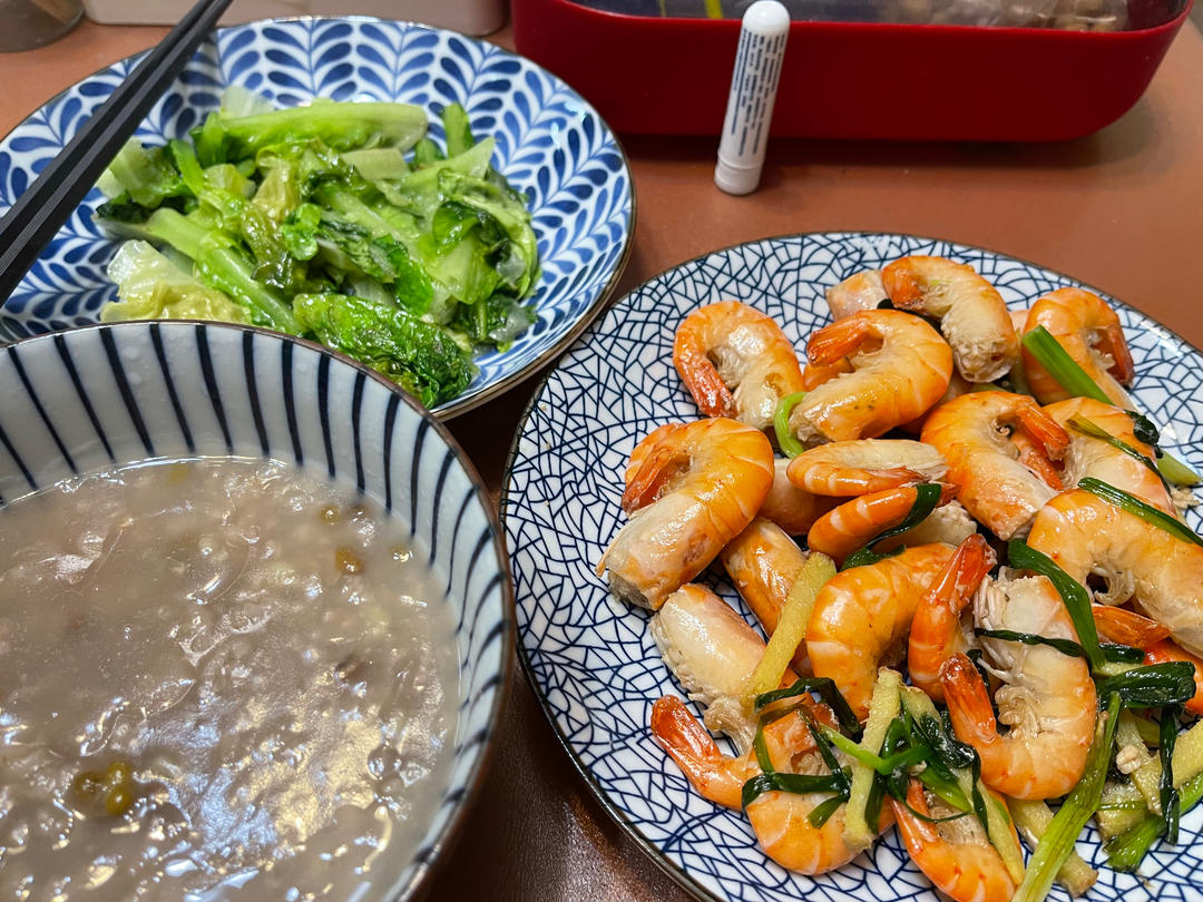 葱姜炒大头虾、炒生菜、绿豆粥