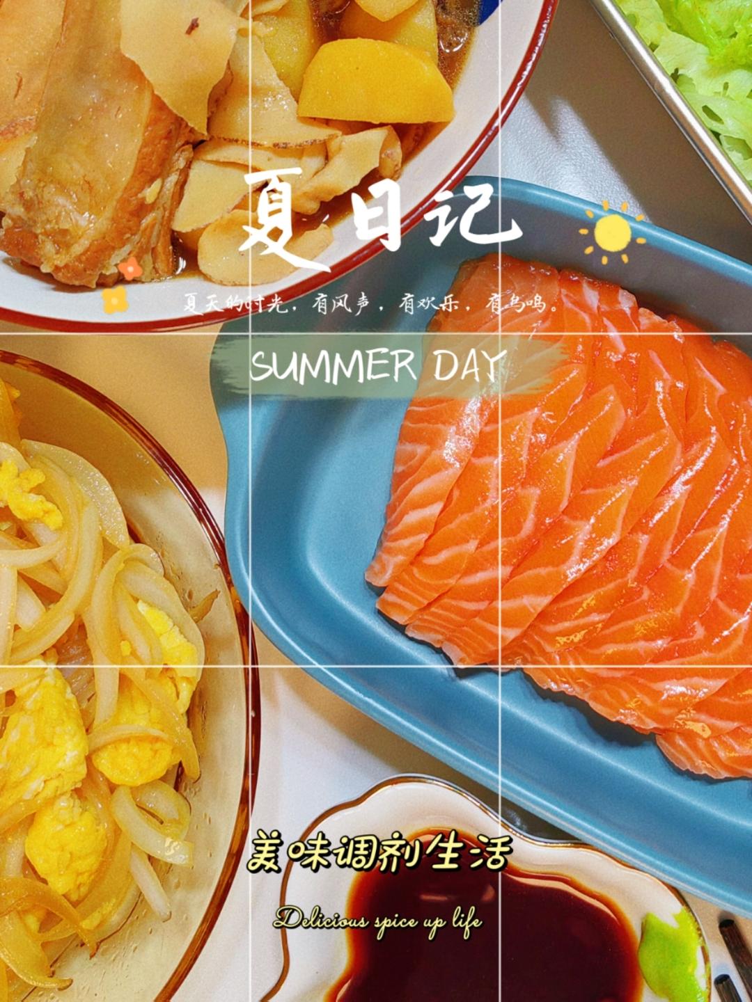 昨天晚餐:洋葱炒蛋,三文鱼刺身,鲍鱼海螺炖排骨