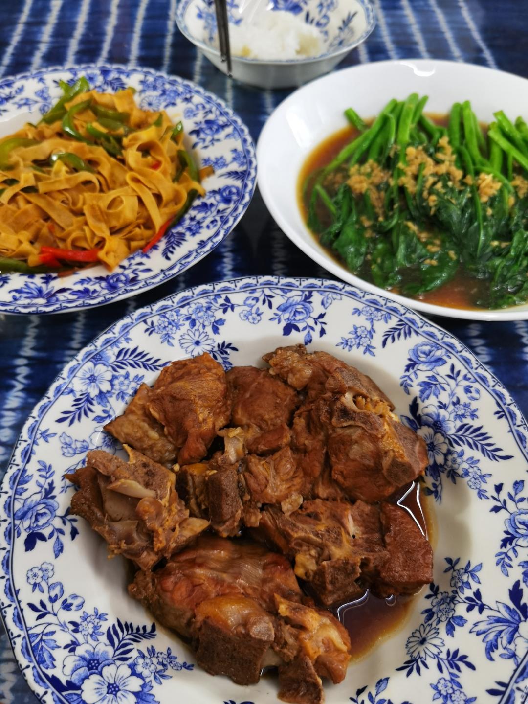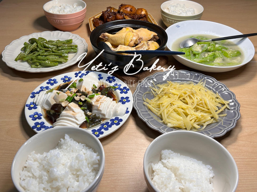 西红柿炒蛋,凉拌豆芽菜和豆角,小米粥,无图
