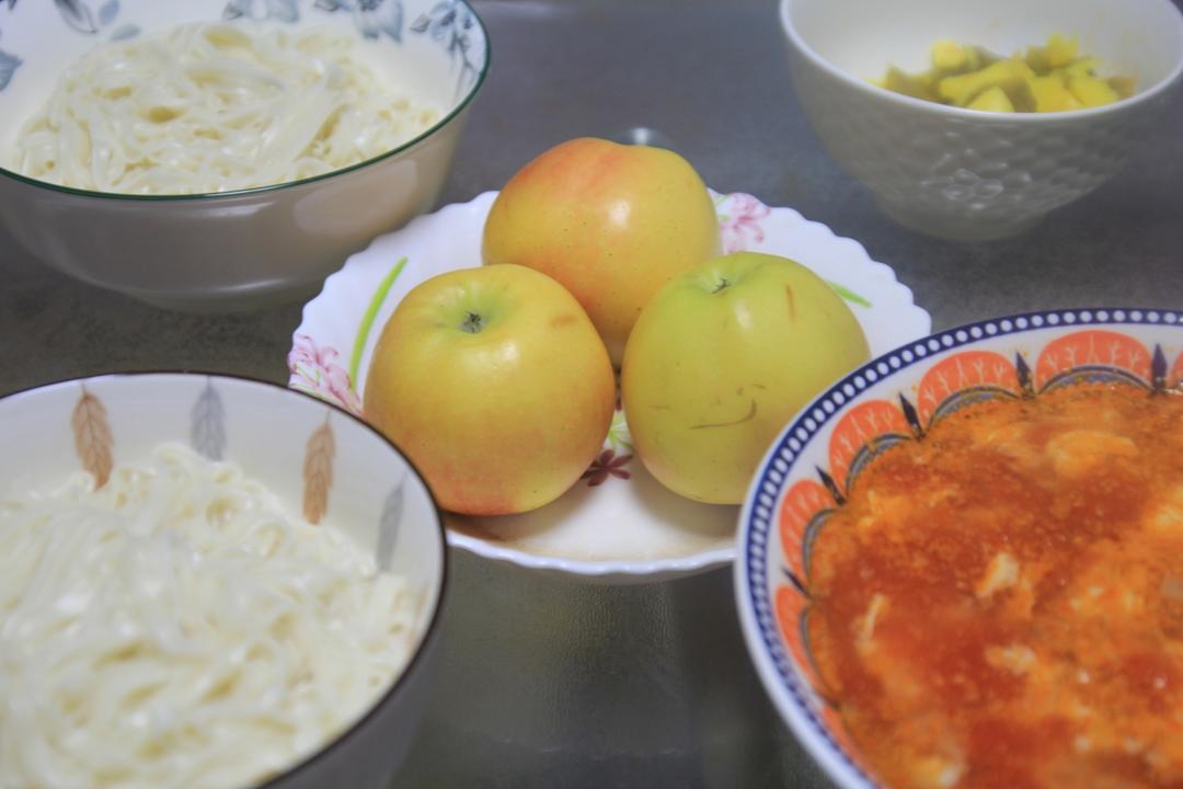 灿烂家早餐 西红柿鸡蛋面+双笋咸菜+苹果,家常的西红柿鸡蛋面,配个咸菜,很舒服的早餐~买...
