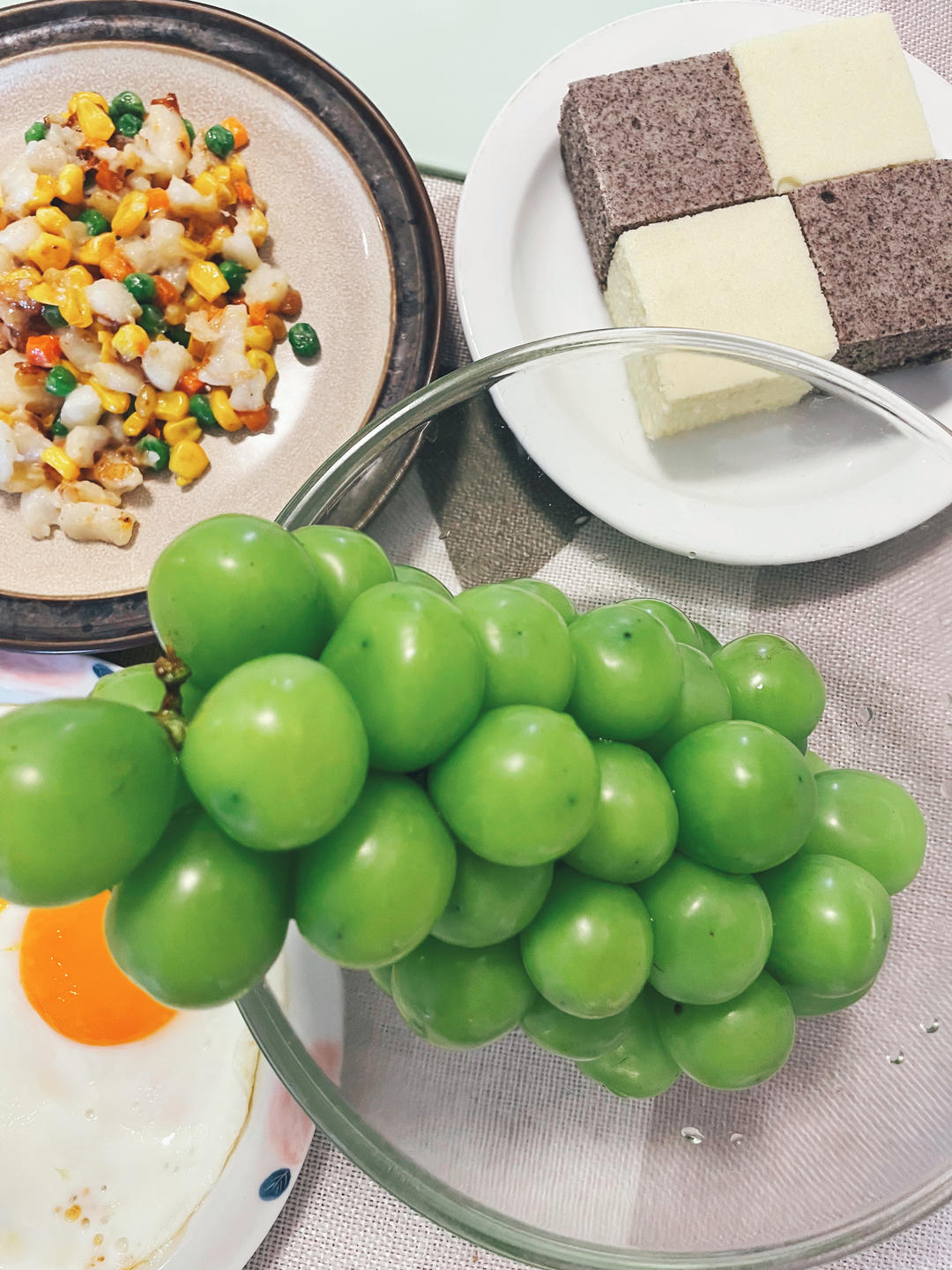 松仁鱼糜,米糕,配红枣小米粥,煎蛋,阳光玫瑰葡萄