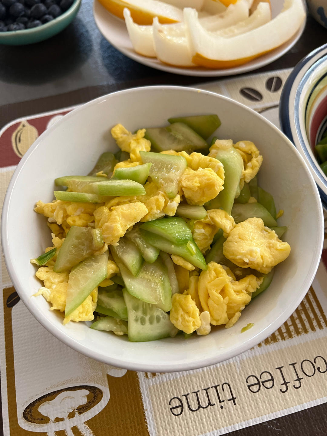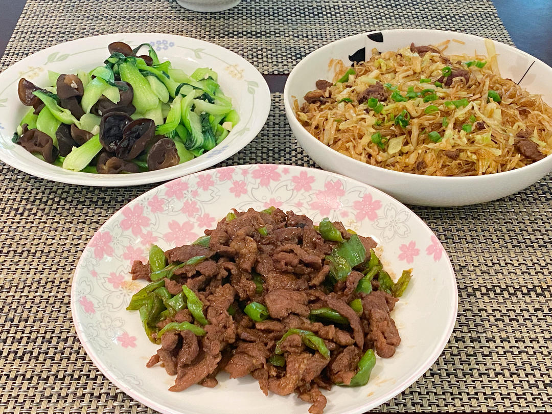 黄瓜炒鸡蛋,蒜炒青椒,牛肉饼