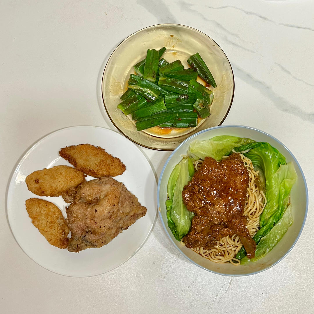 🤡家边上也开了家味德丰,早上来幸运地买到了卤大排,晚上煮面吃(他唯一擅长的就是这个了😝)~再加上他妈昨天单位食堂买的炸鳕...