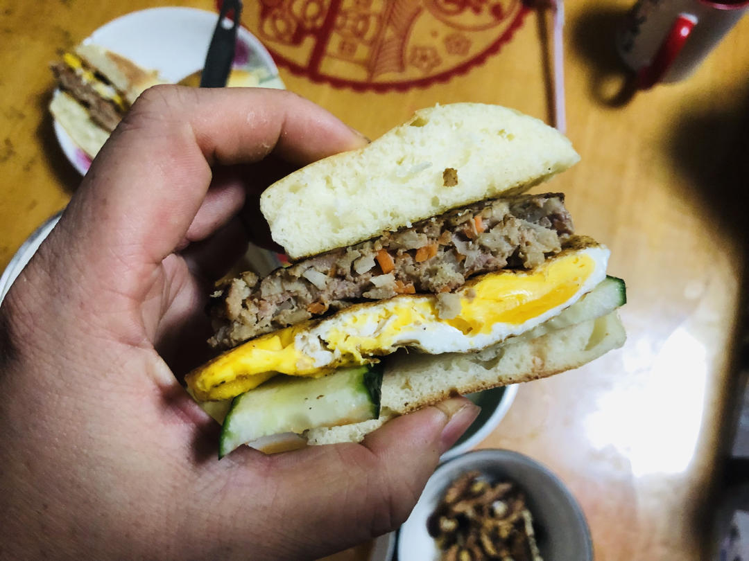 给我家小朋友做的汉堡,夹的自己炖的红烧排骨肉,小朋友超级喜欢吃