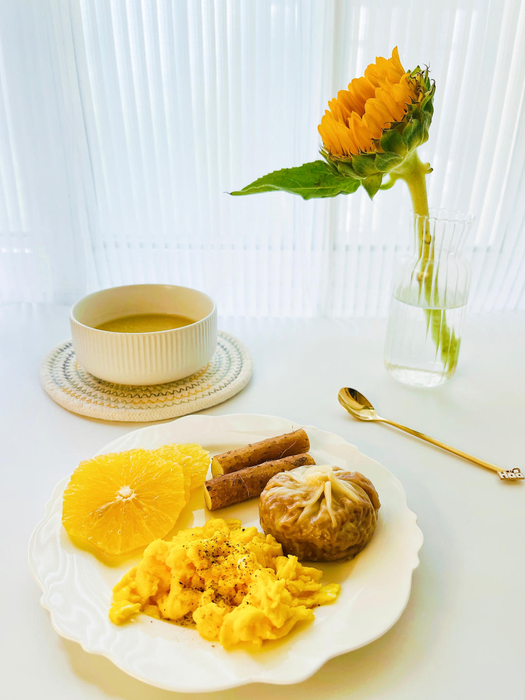 小米粥+牛奶滑蛋+烧卖+山药+橙子