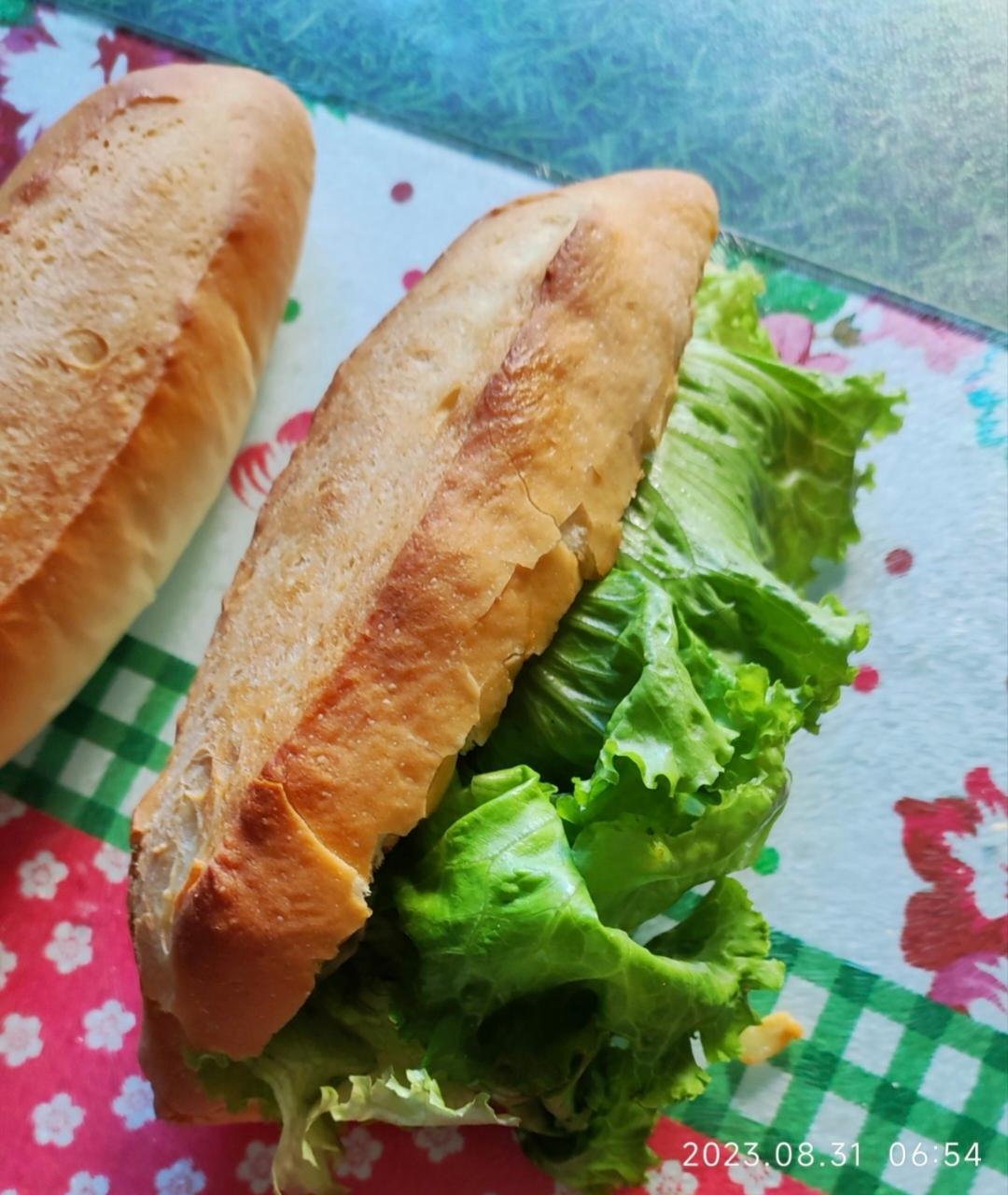 前天试做了2个,手揉的,今天复烤做了个三明治,味道还可以。