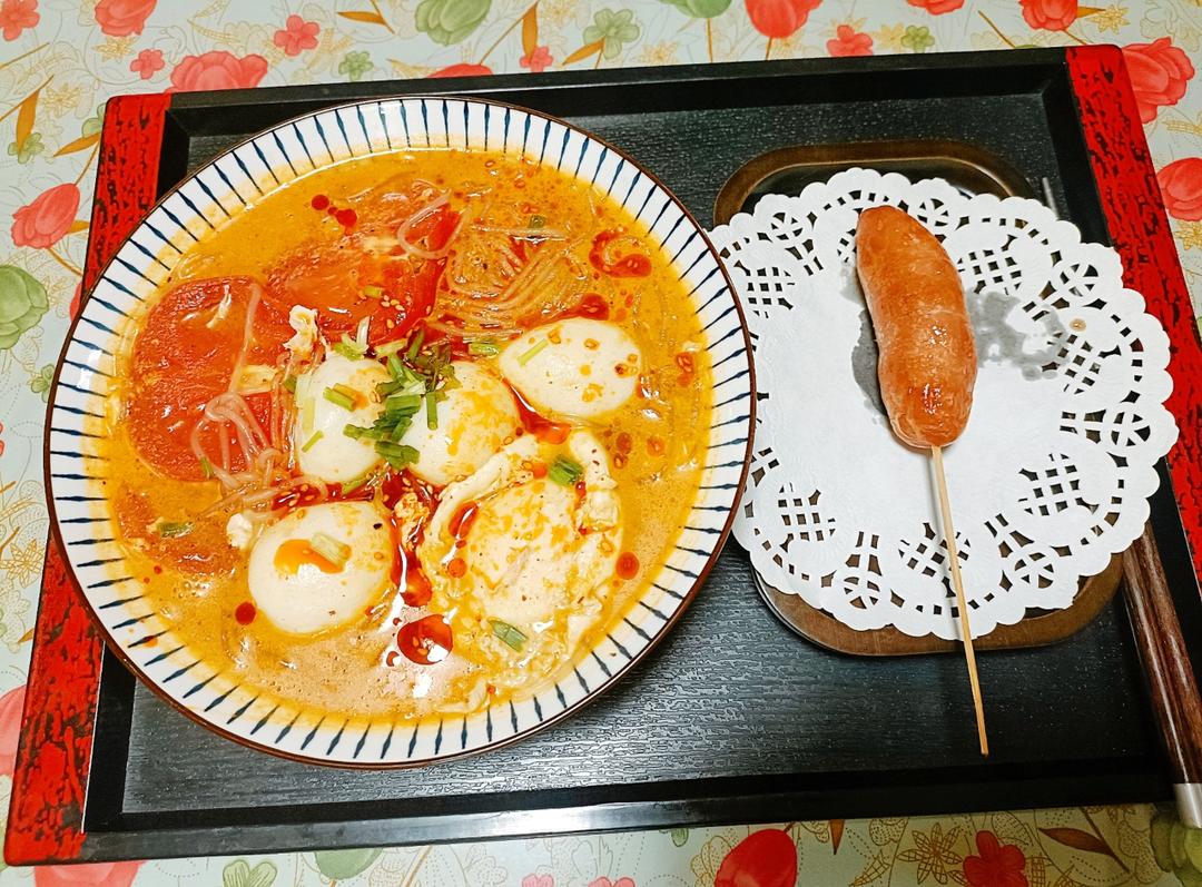 深夜食堂之——鱼丸番茄荷包蛋香辣魔芋粉、烤肠!每次外出吃饭(喜酒),女儿总是吃得特别特别少,回来照例是下一碗面或一碗粉,...