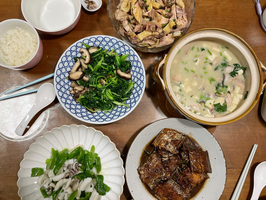 三杯鸡,炖羊肉,臭鲑鱼,鸡胗子,小炒香干,清炒乌贼,空心菜杆