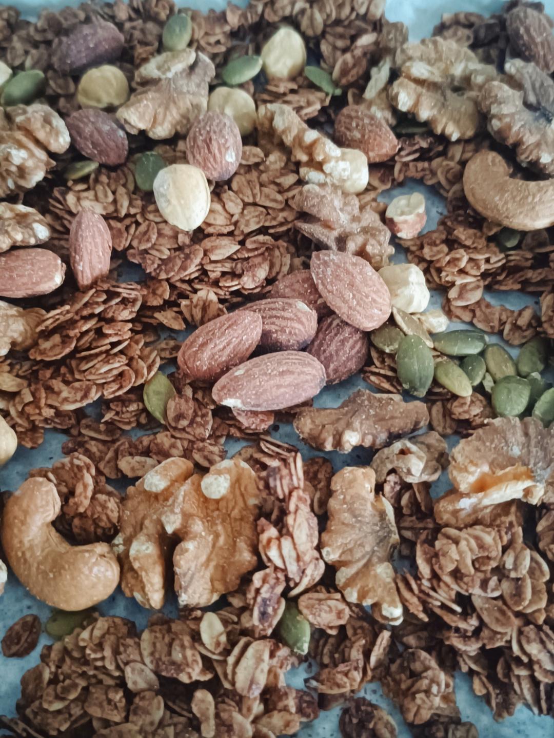 另外加了两勺可可粉,椰子油也懒得下锅,微波炉20秒,搅一搅,烤一烤。先烤15分钟,再翻面加入熟混合坚果。给小朋友吃的就不...