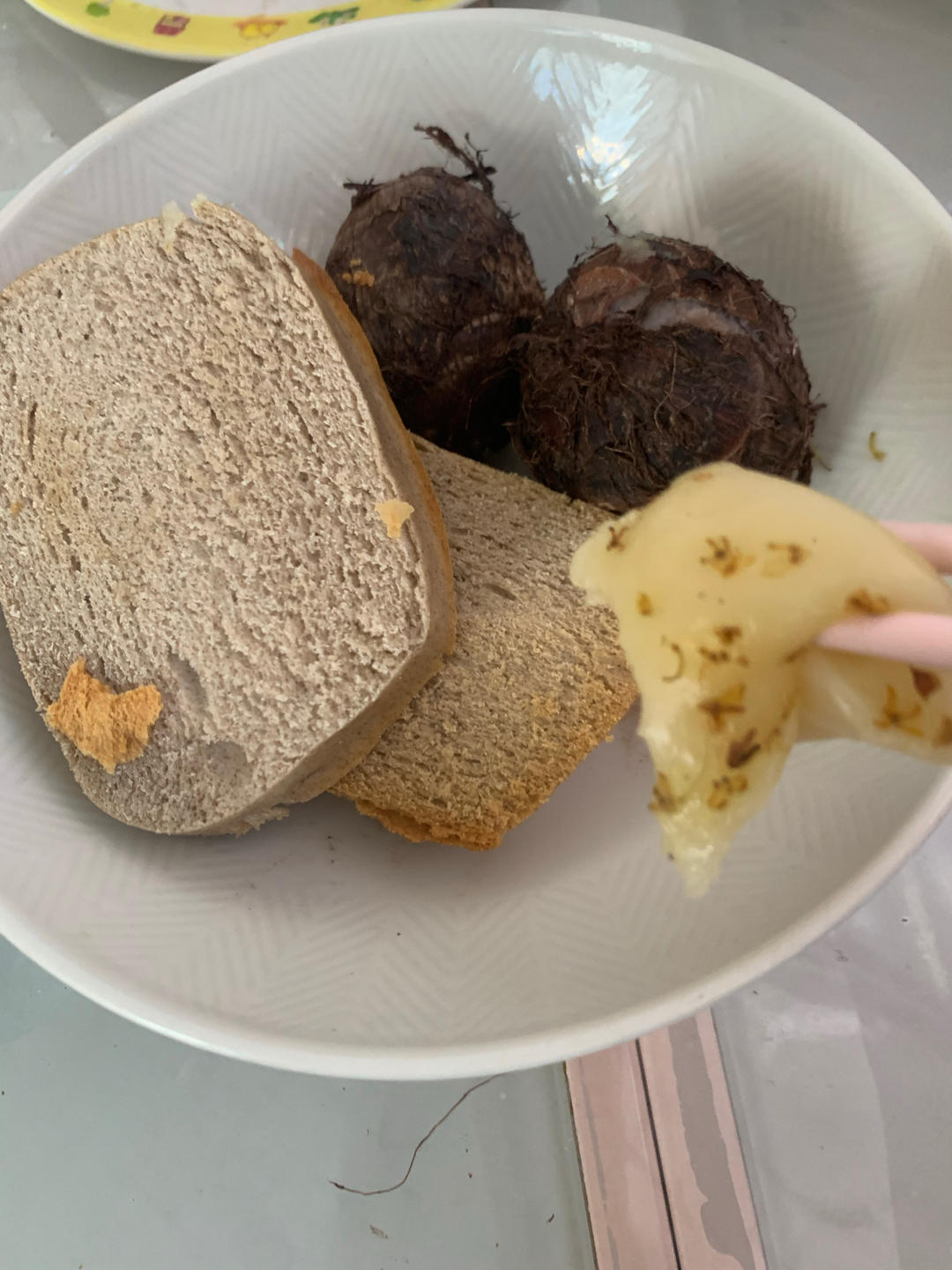 全麦面包、午餐肉、鸡蛋、玉米🌽、红豆燕麦米糊