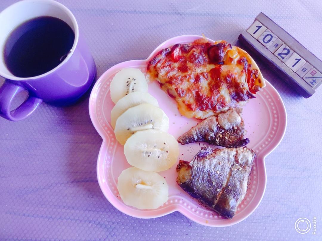 披萨,烤黄花鱼,猕猴桃,咖啡。