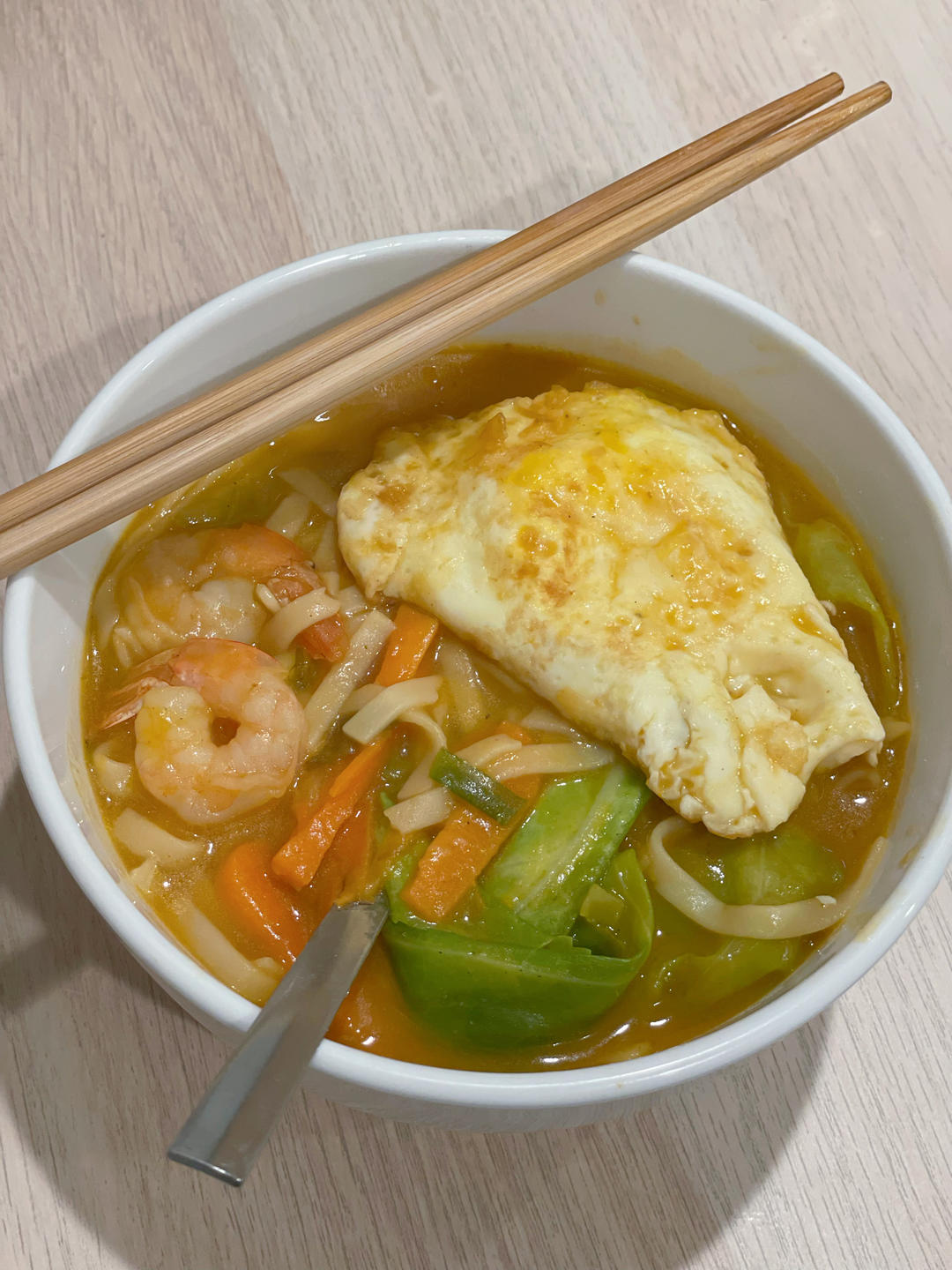 没有高汤,灵机一动用了方便面料包冲水。加了鸡蛋虾仁包菜胡萝卜,兼具生日长寿面&思乡糊汤面属性#晚餐•2023年1...