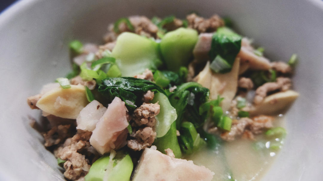 炒了肉馅放一起炝锅做法,纠结要不要打卡决定还是来打一下,因为菜谱实在太好吃了,希望没有太冒犯。。芋头杏鲍菇小油菜,调料只...