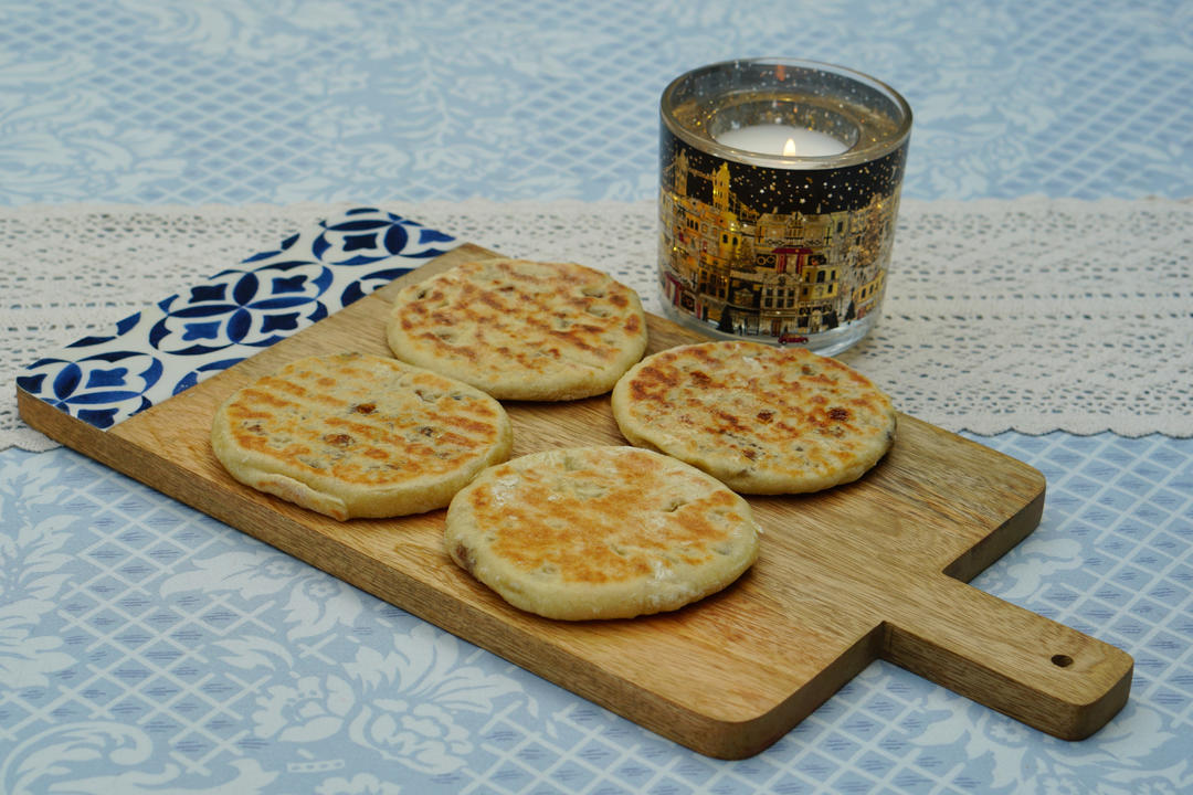 来尝尝我的烫面糖饼,内陷是红糖,肉桂粉,椰蓉和葡萄干,好像数量少了没吃够😂。#午餐•2023年11月5日...