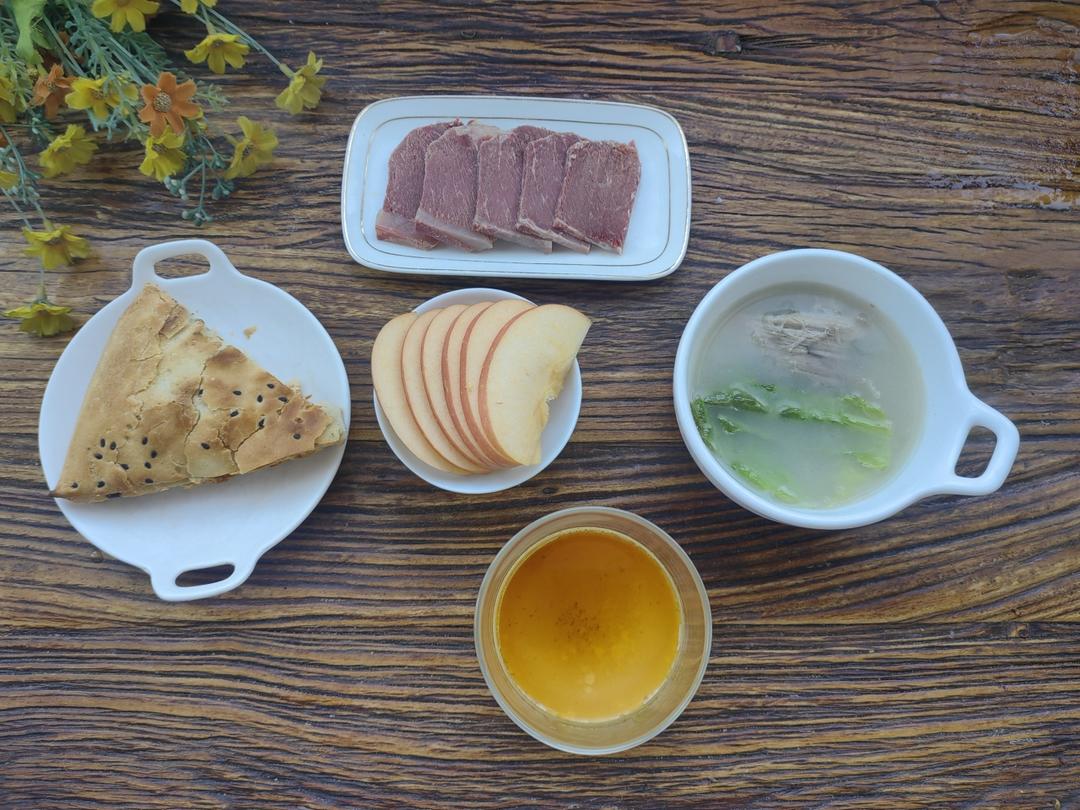 鸭架汤🥣+饼子🍥+鸡蛋羹🍮+牛肉🥩+苹果🍎