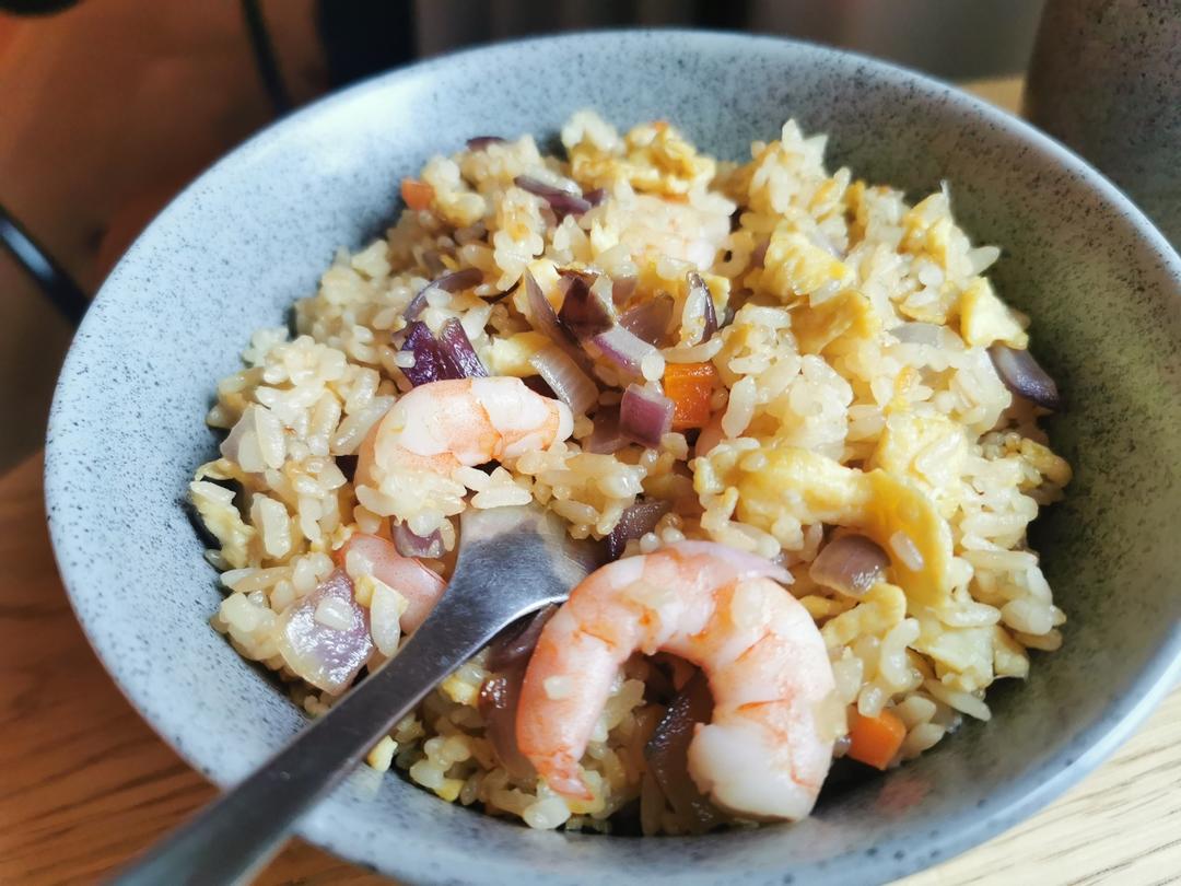 虾仁蛋炒饭,黄油煎三文鱼,炒青菜