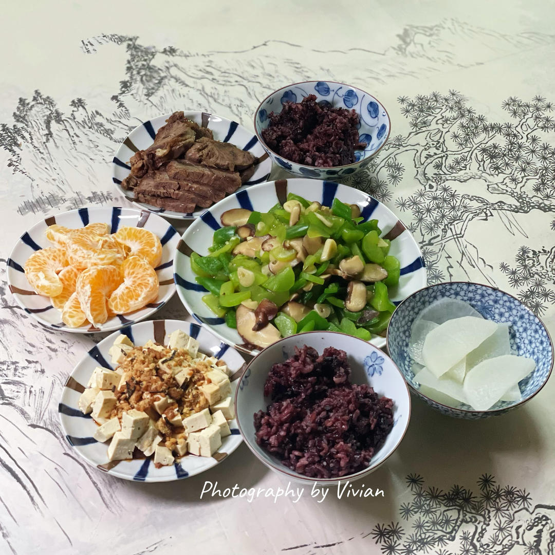 午晚餐|酱牛肉+青椒香菇莴苣+肉松拌黑豆豆腐+黑米米饭+清蒸萝卜+耙耙柑~🌷