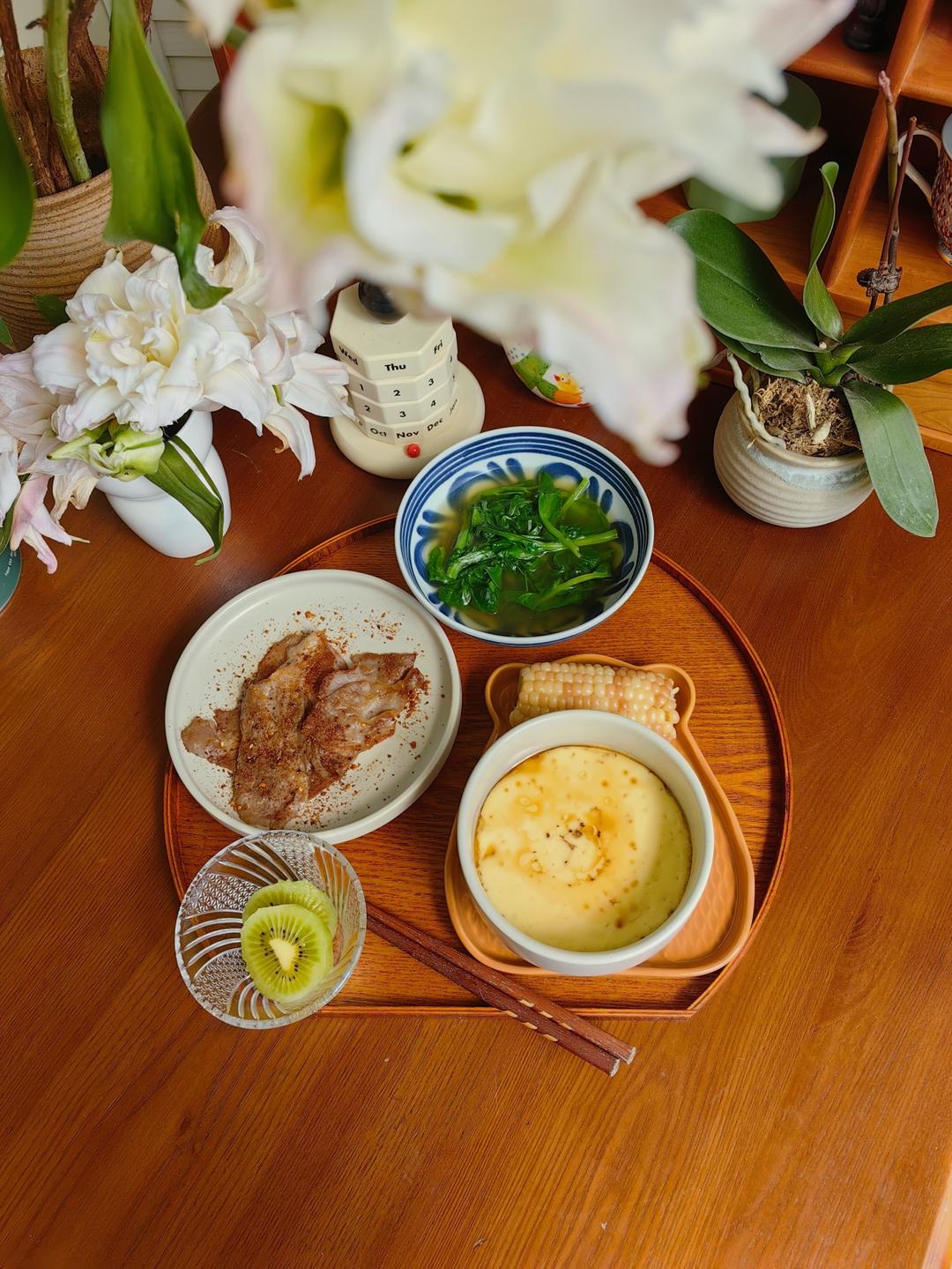 蒸鸡蛋羹,豌豆尖汤