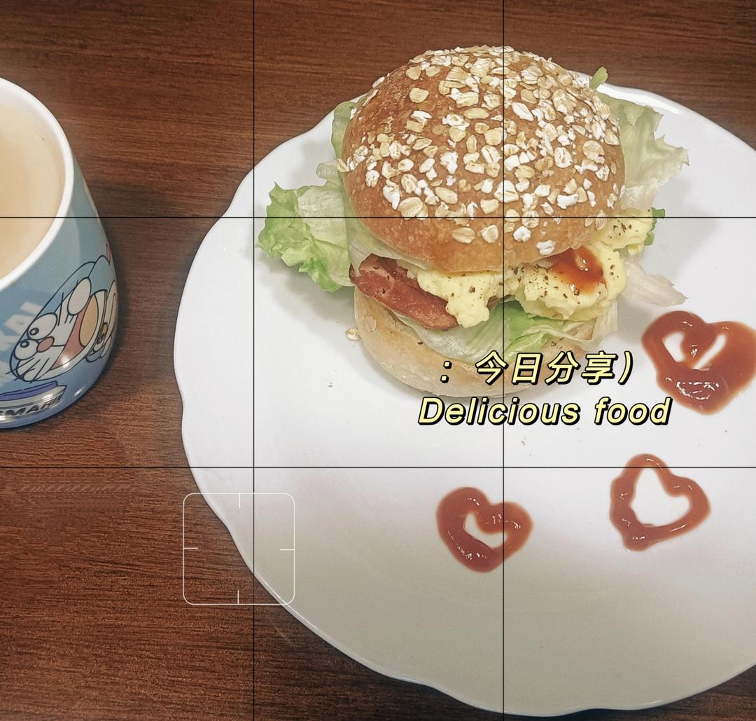 自制汉堡🍔,空气炸锅复烤下,培根🥓煎煎➕美式炒蛋,来上几片生菜,挤上一点番茄酱,完美大汉堡🍔,再来上一杯奶咖[咖啡],美...